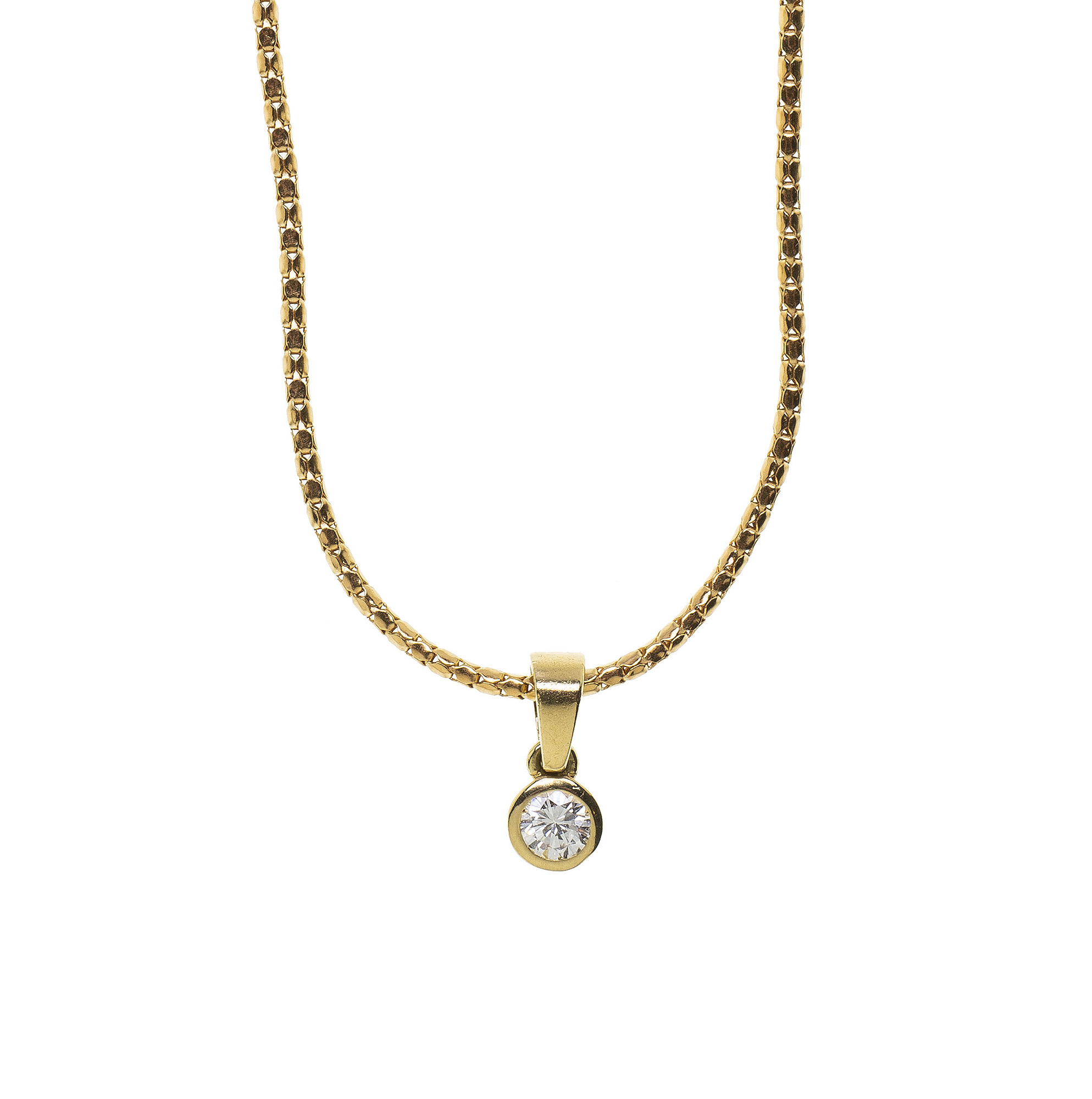 Catenina in oro giallo 18 Kt con piccolo pendente impreziosito da un diamante (0.25 ct). Il peso è di 6 gr.