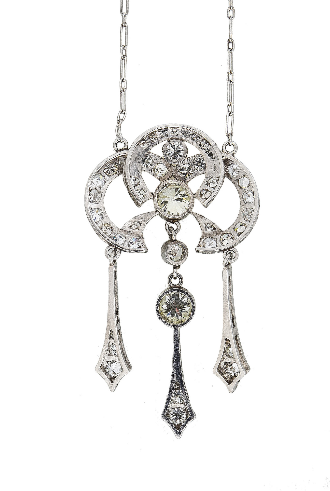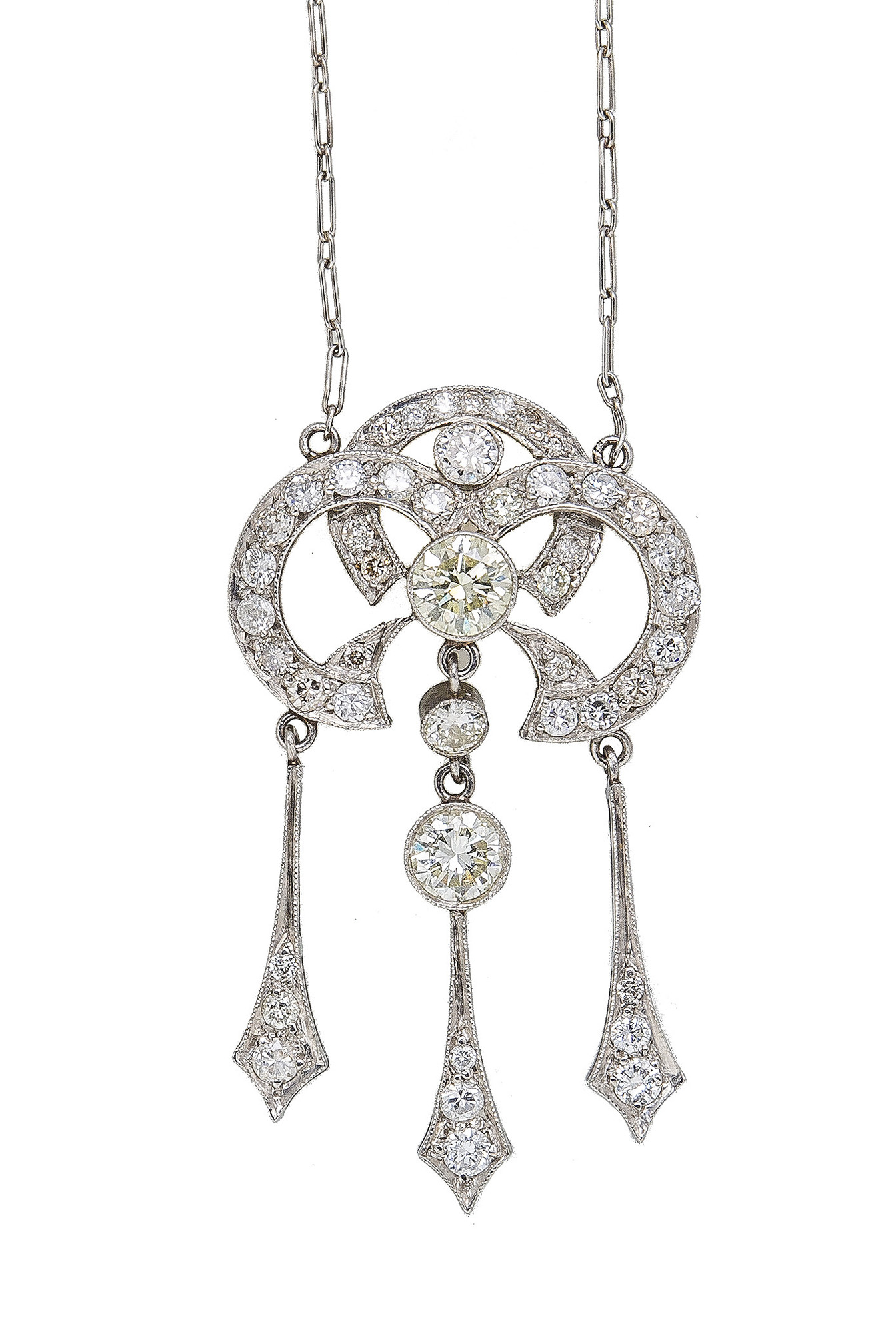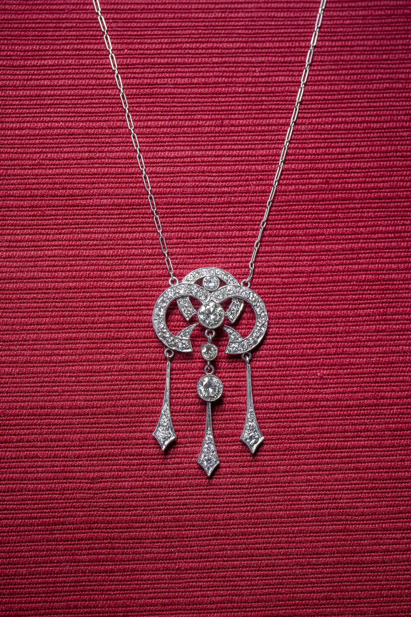 Pendente con catenina, anni '30, in oro bianco 18Kt decorato con due diamanti centrali (0,40 ct. cad). Il pendente è impreziosito da ulteriori diamanti (0.80 ct). Il peso è di 7.90 gr.