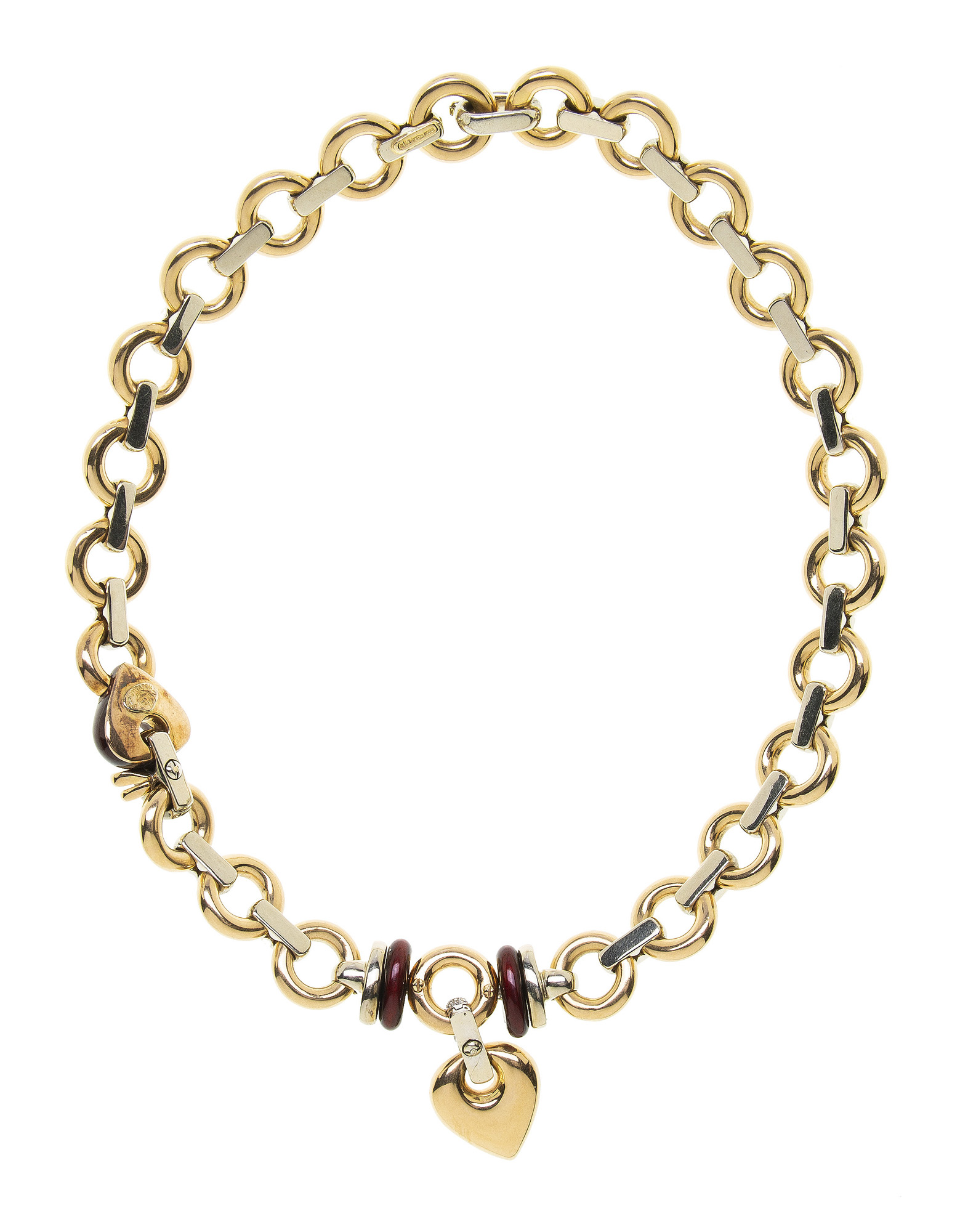 Demi-parure Nouvelle Bague, anni '80/'90 composta da girocollo e bracciale in oro 18 Kt impreziosita da elementi smaltati e decorati con diamantini. Il peso è di 148, 25 gr. La lunghezza del girocollo è di 42 cm. La lunghezza del bracciale è di 22 cm.