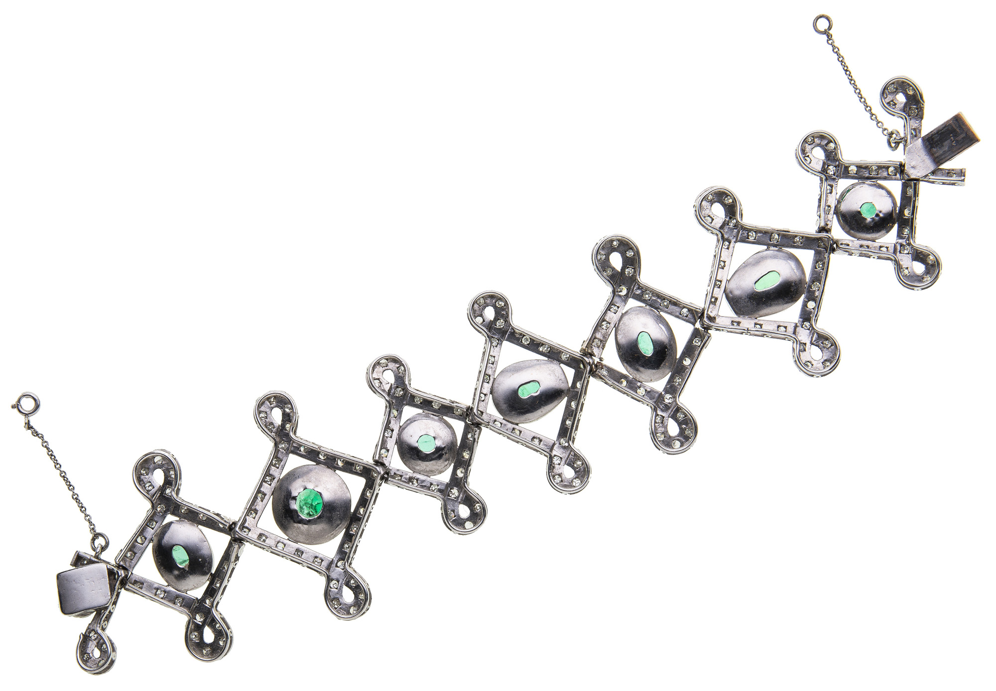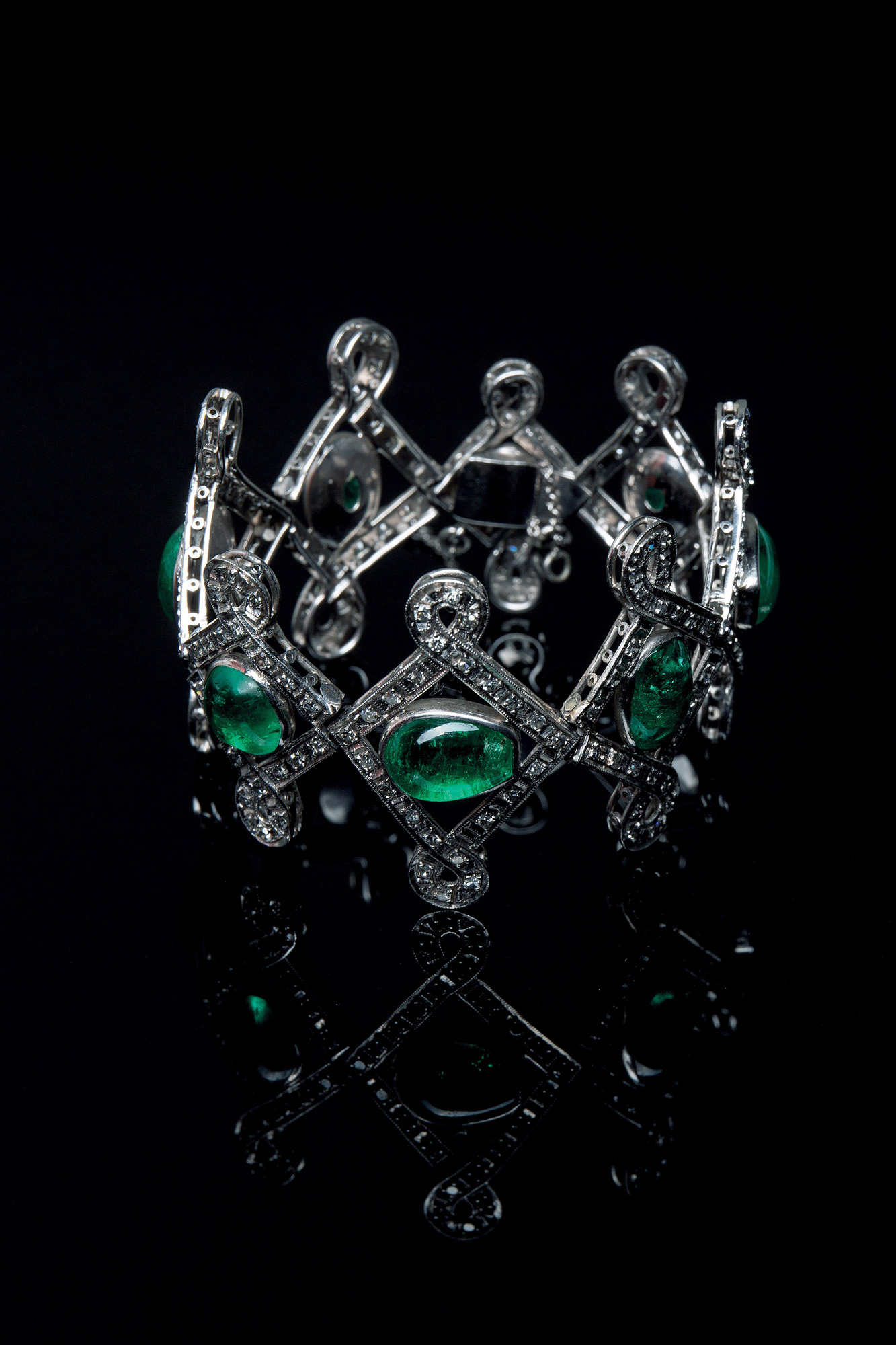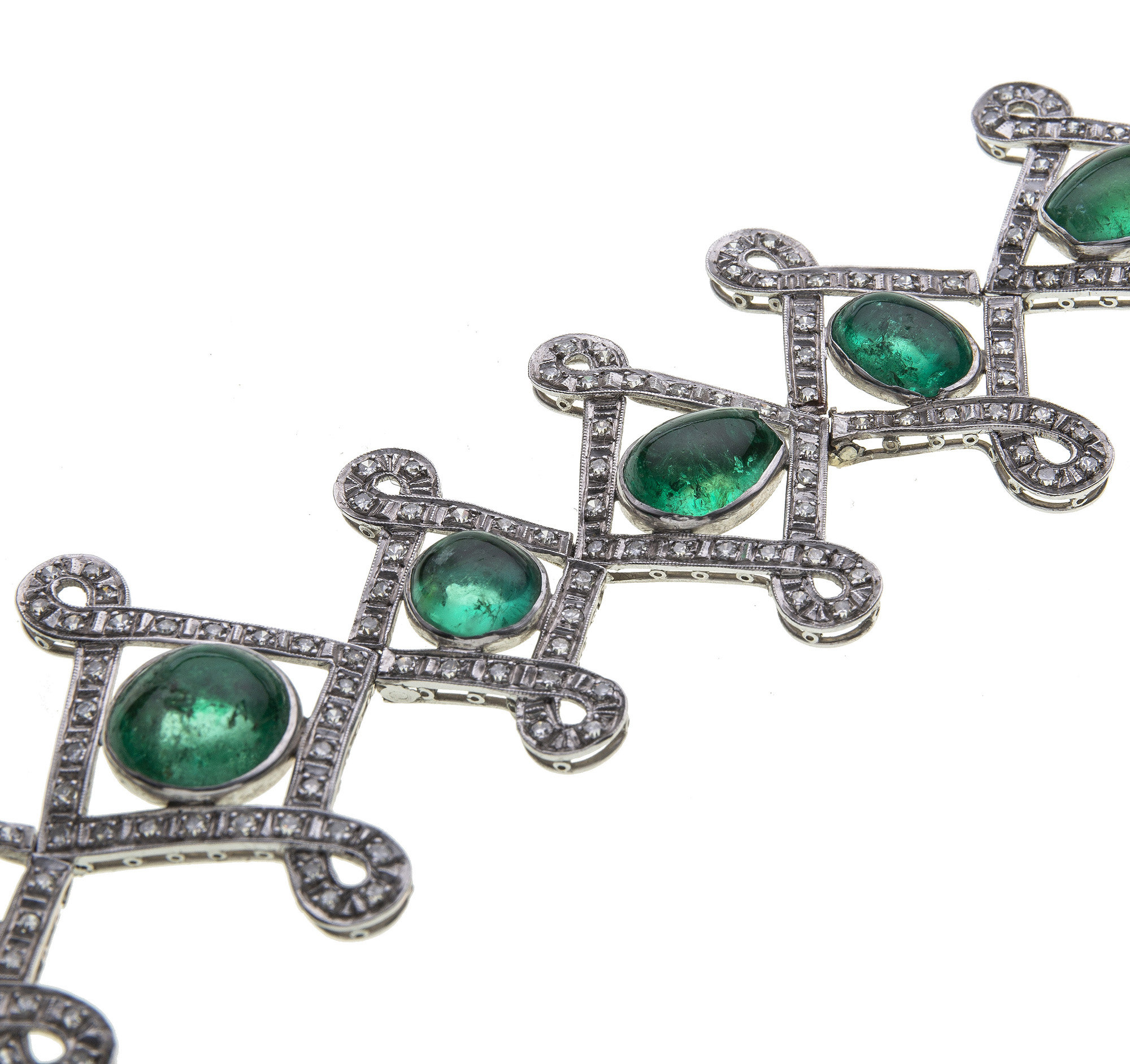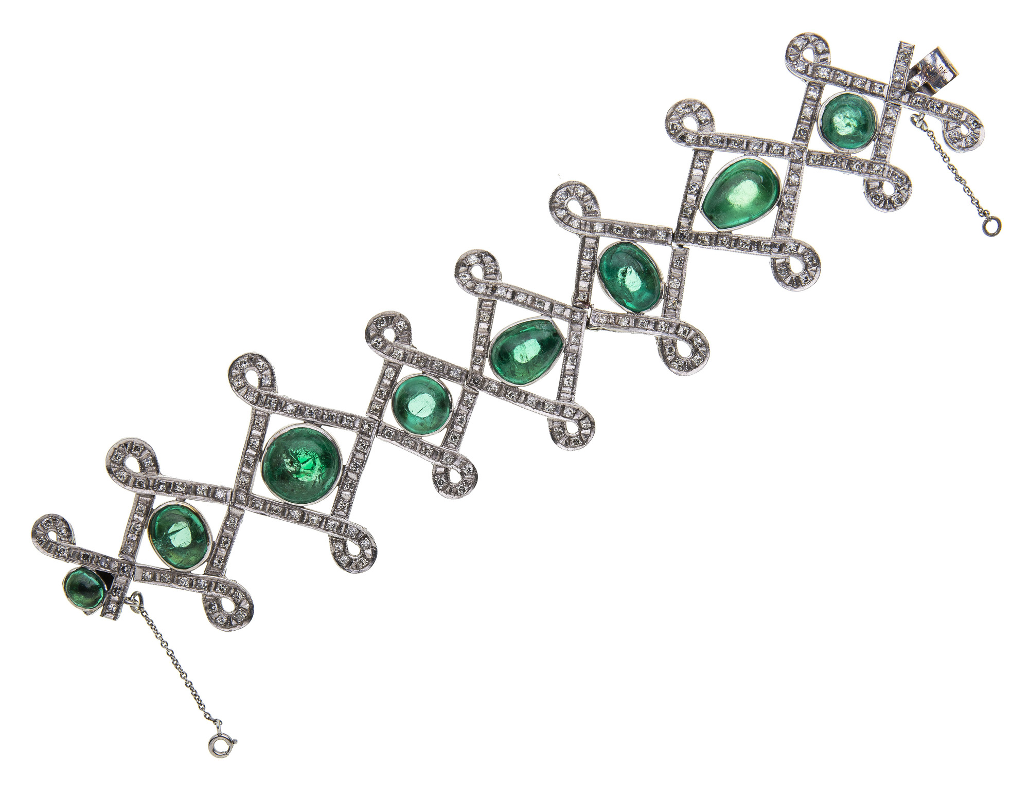 Bracciale, anni '50, in oro bianco 18 Kt composto da elementi geometrici decorati da smeraldi cabochon ( 40 ct ca.) e diamanti (2 ct). La lunghezza del bracciale è di 18,5 cm. Il peso è di 40 gr.
