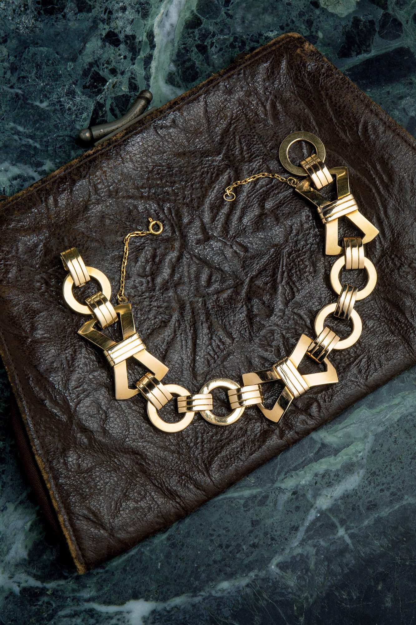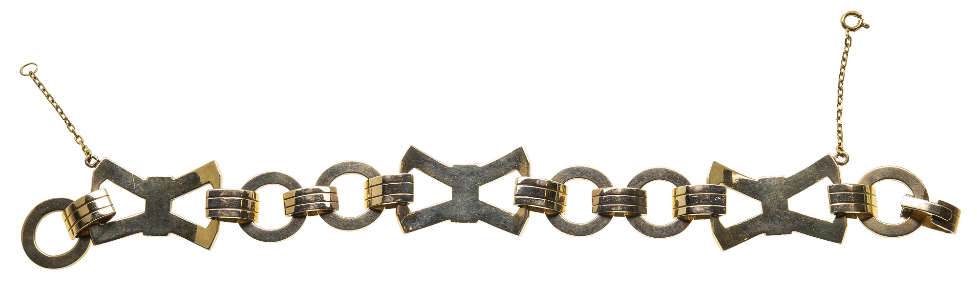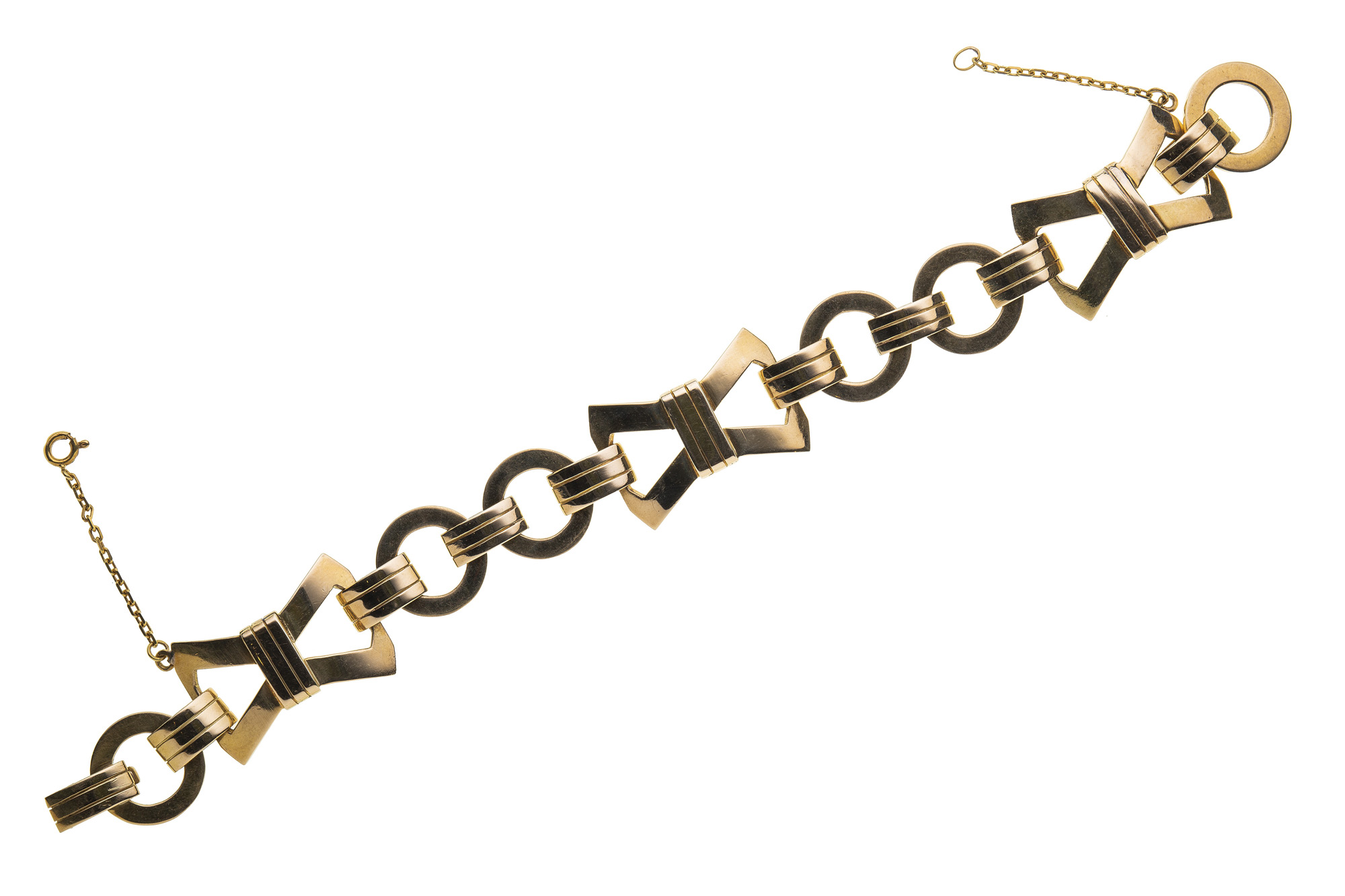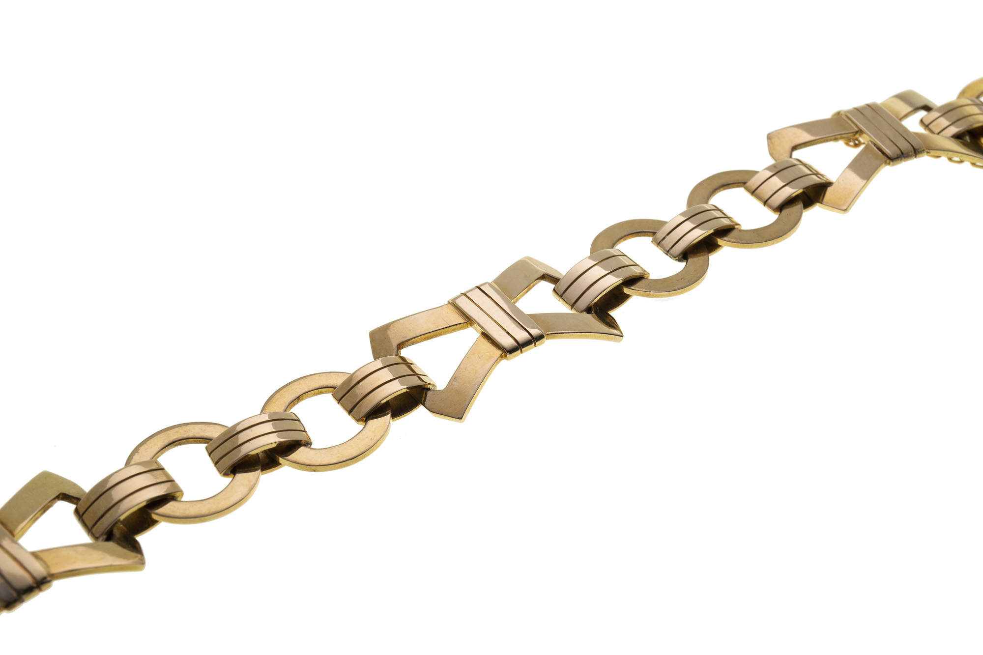 Bracciale a maglia, anni ' 40, in oro giallo 18 Kt inciso, composto da elementi di forma geometrica. La lunghezza è di 20 cm e il peso è di 49 gr.