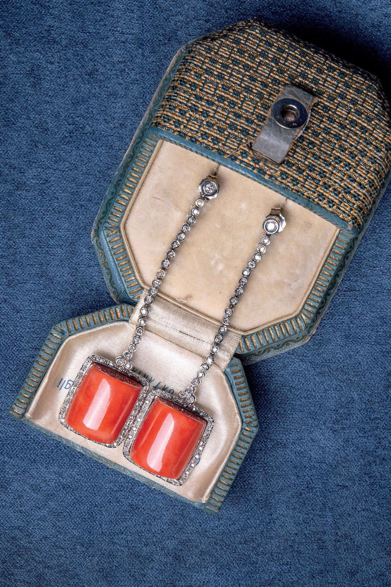 Orecchini pendenti in oro 18 Kt con corallo e diamanti