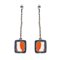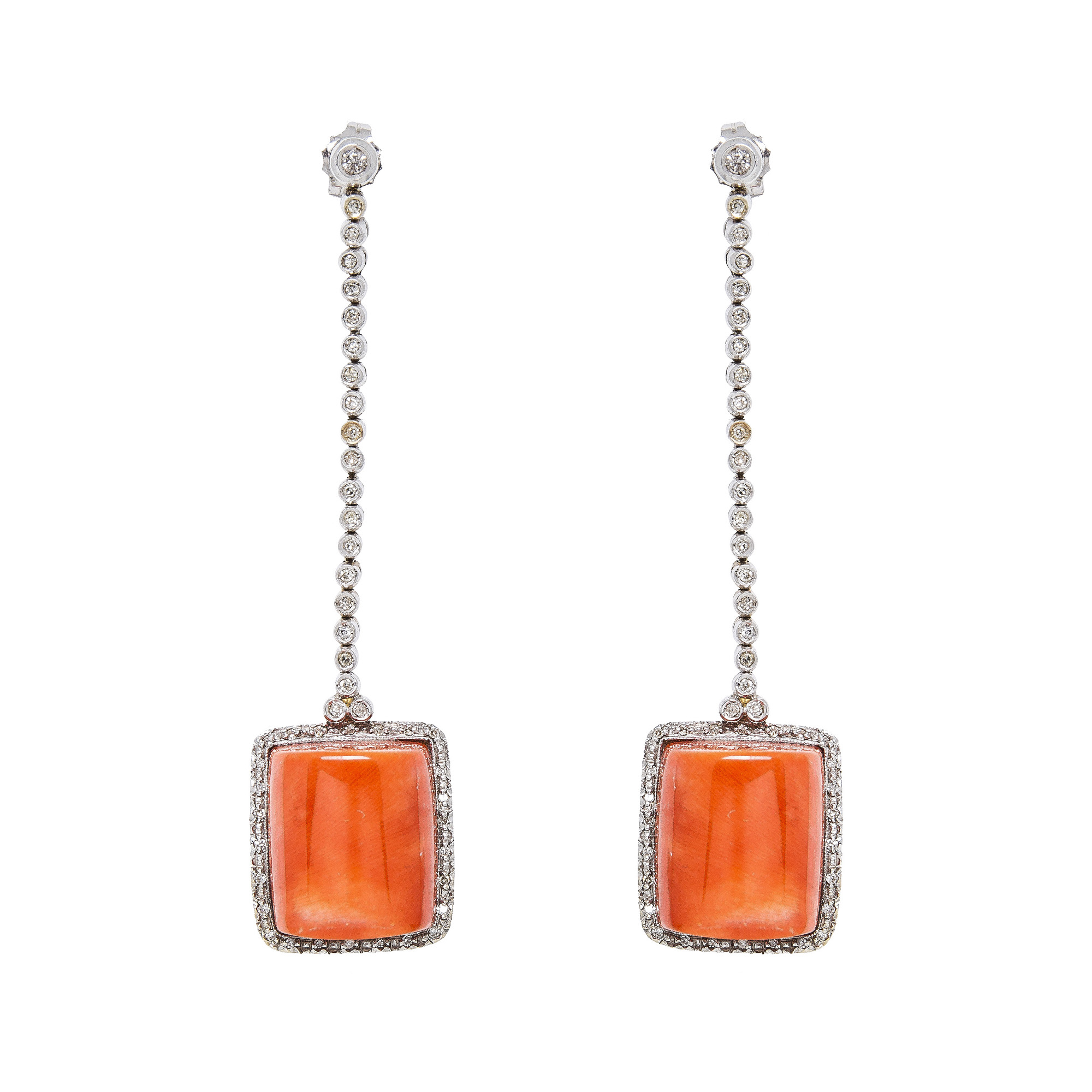 Orecchini pendenti in oro bianco 18 Kt realizzati con una fila di diamanti (0,50 ct). Il pendente si compone di un elemento in corallo contornato da diamantini. Il peso è di 19,80 gr. Trattasi di orecchini per lobi forati.