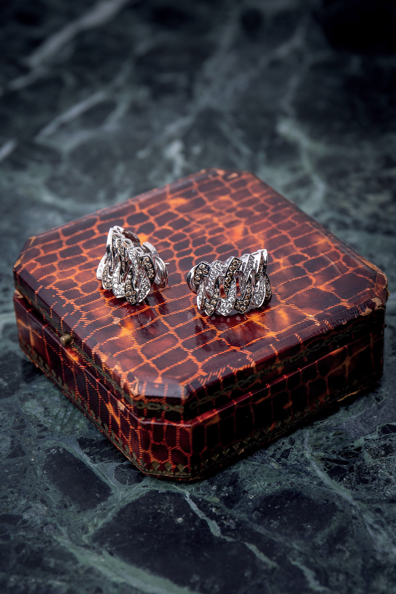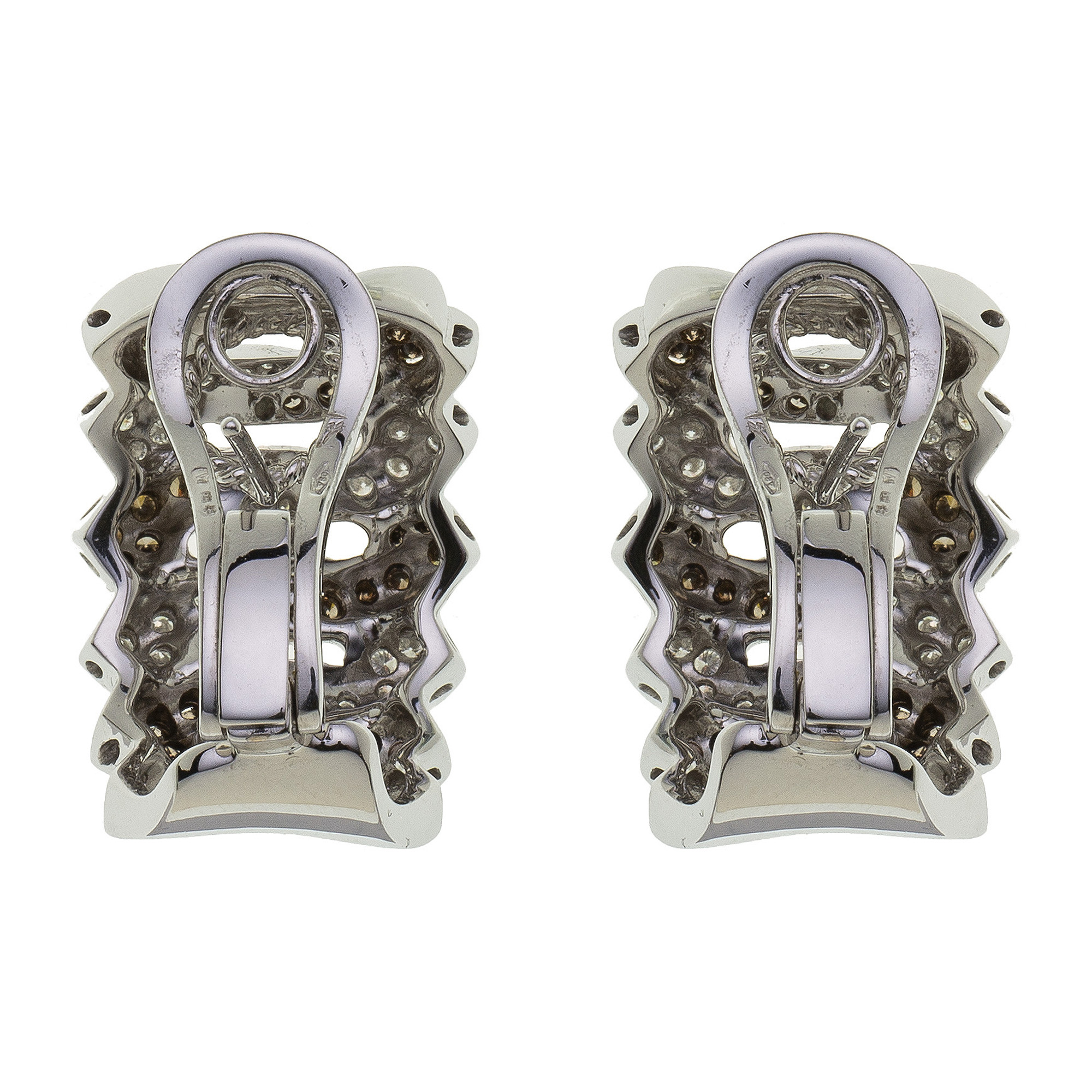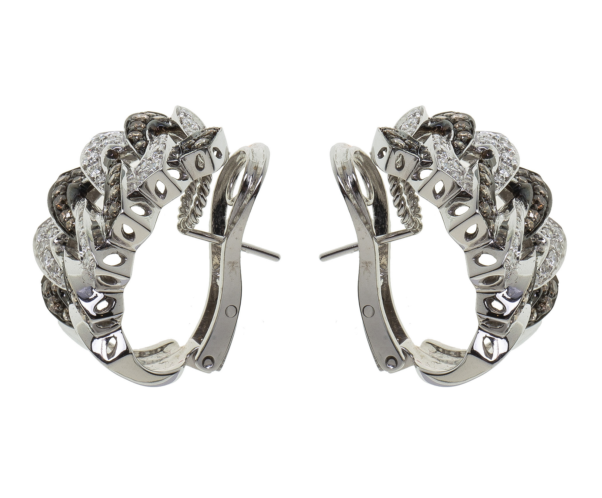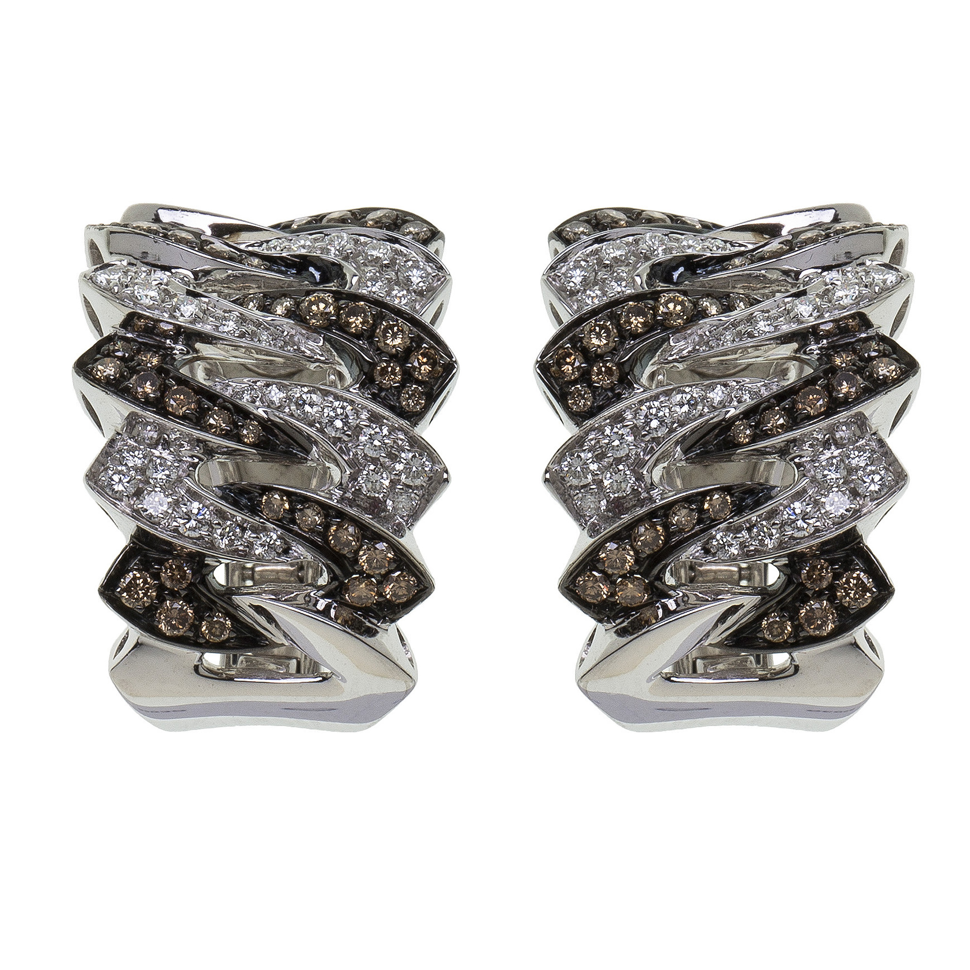 Orecchini in oro bianco 18 Kt con lavorazione a motivi geometrici decorati in modo alterno con diamanti bianchi e diamanti brown (1,40 ct). Il peso è di 24 gr. Trattasi di orecchini per lobi forati.