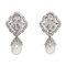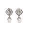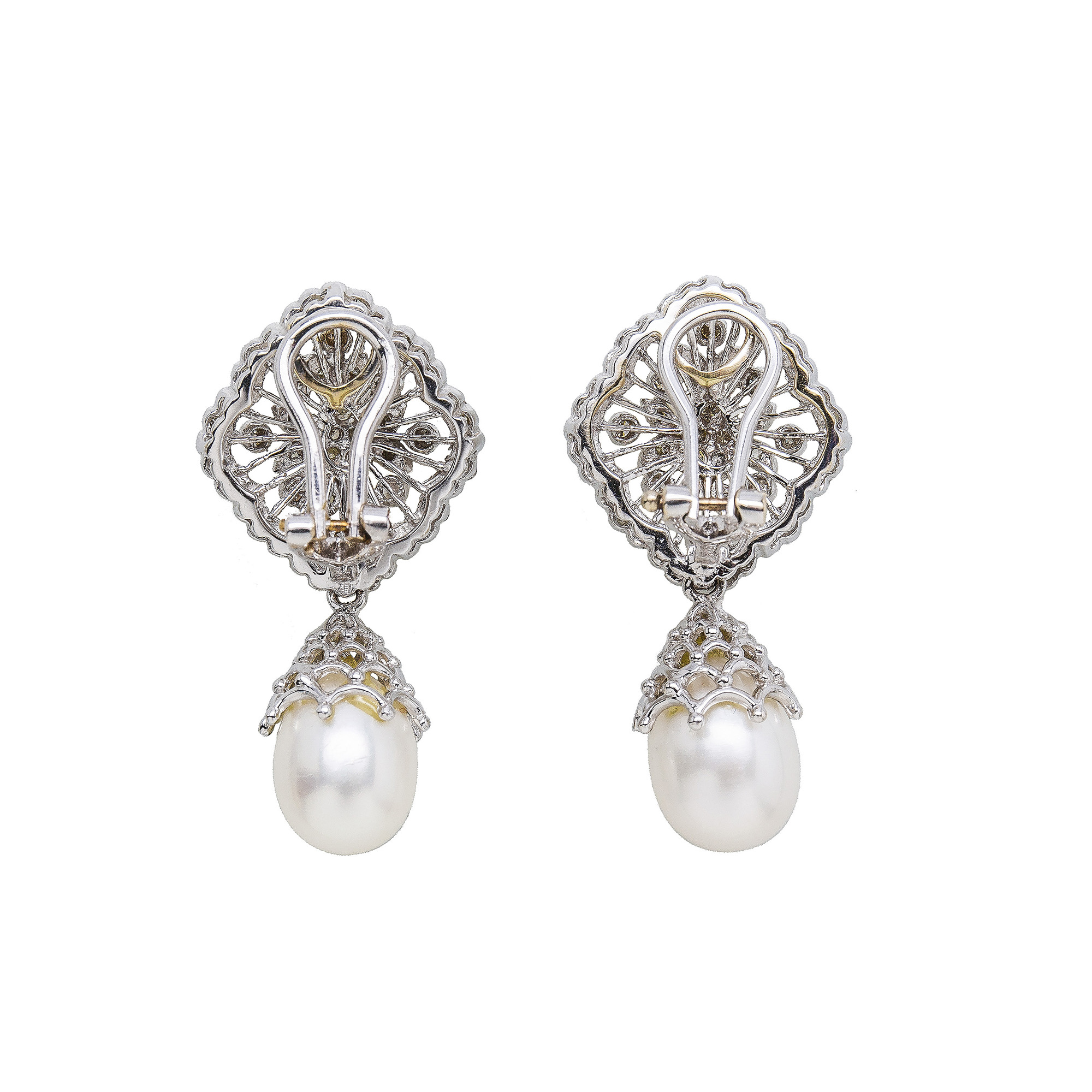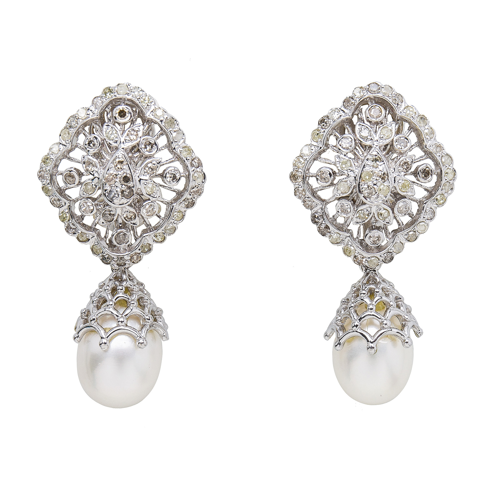 Orecchini pendenti con montatura in oro bianco 18 Kt impreziosita da diamanti (1 ct). Il pendente si compone di una perla d'acqua dolce. Il peso è di 14,80 gr.