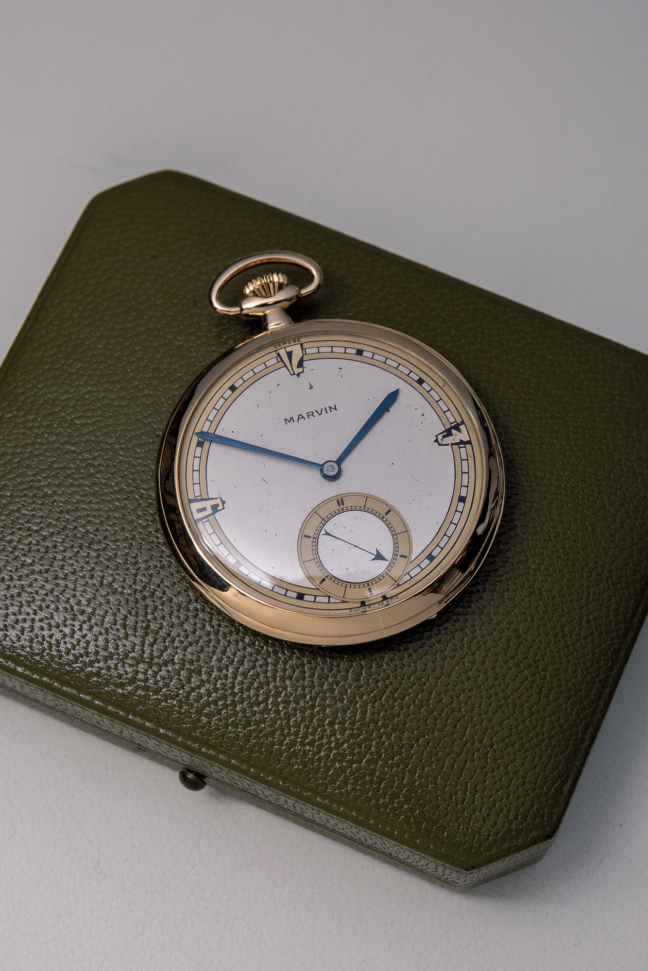 Orologio da tasca in oro 18 Kt , marchio Marvin. Quadrante déco con indici a cuneo, minuteria a settori a doppio binario a due colori. La seconderia estremamente rara, è rappresentata da un disco rotante con indicatore a freccia. Funzionante. Ottime condizioni.
