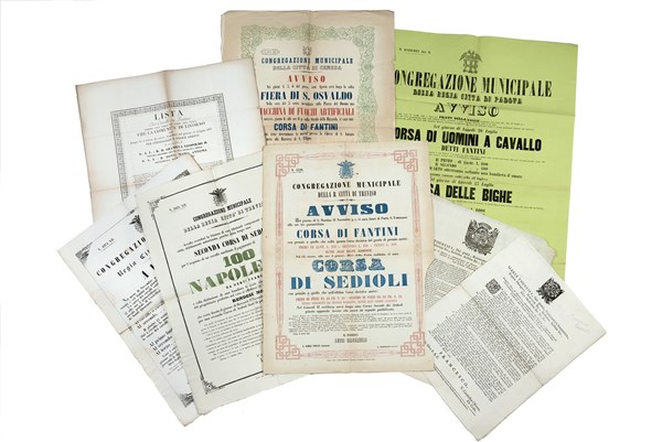 An interesting lot of posters, some in colour, and grida about horse racing. Included is: Lista dei Cavalli con fantino ammessi alla corsia del Palio alla Lunga che la comunità di Livorno darà.per festeggiare il felice arrivo del Granduca Leopoldo II. Livorno: Meucci, June 13, 1833. Poster (660x530 mm), text within a lithographic frame.