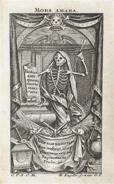 4 parts in one volume, 8vo (131 x 90mm). First part with engraved title and 57 plates (numbered 1-58 including title and without the usually censored plate 59); second part with 15 portraits of Saints (the third plate torn with serious loss); third part with title page and 24 plates numbered 1-24; fourth part with 3 plates on the Last Judgment, death and hell (slight browning, some small stains and a tiny tear to the first leaves). Contemporary calf decorated in gilt, decorated floral endpapers (light wear). The volume has more plates than other copies described, it is sold as catalogued and not subject to return.