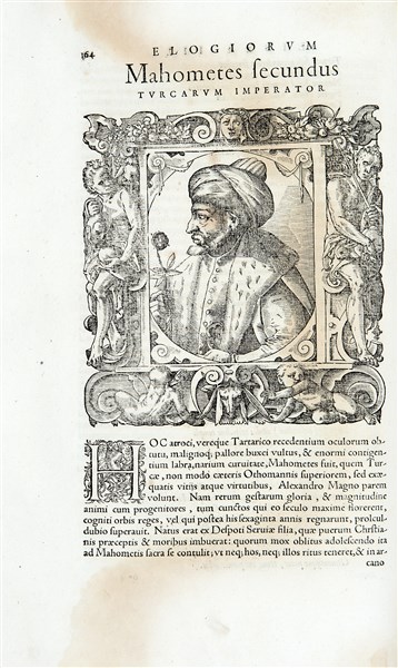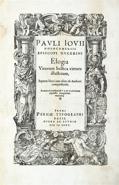 Prima edizione degli Elogia virorum bellica di Giovio con le celebri illustrazioni di Tobias Stimmer. L'artista fu inviato dall'editore Perna a Como per copiare dal vivo i ritratti che ornavano il celebre museo del Giovio. "The first comprehensive and generally accessible source for the likeness of persons in whom the contemporary learned public was interested" (Jakob Burckhardt).