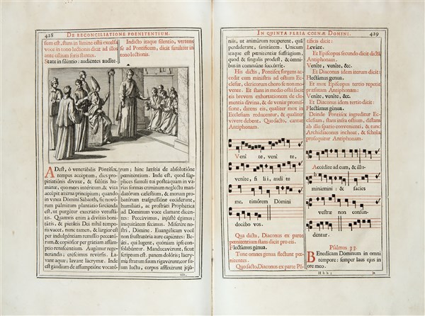 Folio (415 x 280mm). Third part only, printed in red and black, text in two columns within border, numerous half-page engravings, engraved initials. Contemporary calf with the arms of Benedict XIV within a rich floral border, title and decorations in gilt on spine, gilt edges, marbled endpapers, preserved in a modern case (light scuffing, faded gilding of the edges).