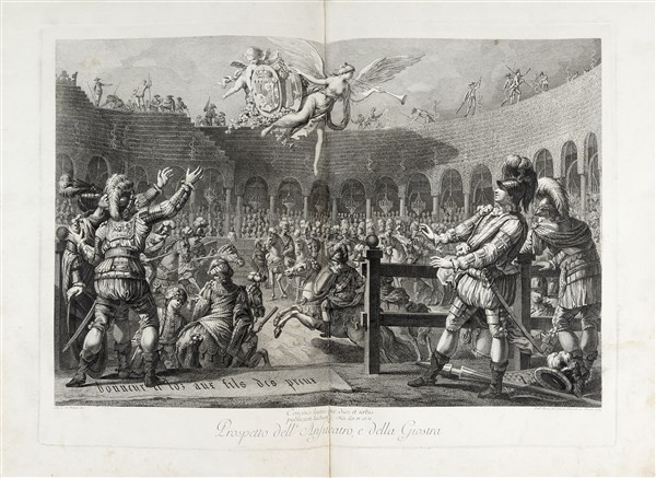 A fine copy with the arms of Duke Ferdinand I of Bourbon-Parma (1751-1802) of this festival book printed by Giambattista Bodoni and produced in celebration of the Duke's wedding with Maria Amalia (1746-1804), Archduchess of Austria, in 1769. The various festivities that marked the marriage, illustrated and described here in great detail, included tournaments, costume balls, an elaborate fireworks display, a pastoral play, and a Chinese fair. Several plates pay particular attention to those who attended and their attire and the coat-of-arms of some participants is also included. The elaborate celebration was designed by Ennemond Petitot (1727-1801), the first Architect of the Duchy. The edition was thought to have been printed in 1,002 copies, which are housed in different bindings. This copy is one of 144 bound in bazzana, i.e., mottled calf; some of these also bear the Bourbon-Parma coat of arms in gilt, as with the present example.