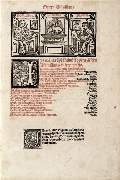 Edizione del primo XVI secolo della celebre opera di Sallustio pubblicata in eleganti caratteri e iniziali xilografiche da Gueynard a Lione.