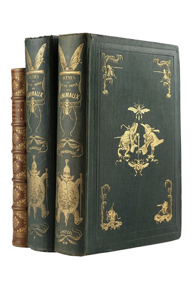 2 volumes, 8vo (270 x 185mm). Frontispiece and 95 plates in first volume, frontispiece and 104 plates in the second (occasional light foxing). Green editorial binding decorated in gilt in perfect condition. [TOGETHER WITH:] GRANDVILLE, Jean-Jacques - OLD NICK, Paul-Émile. Petite miseres de la vie humaine. Paris: H. Fournier, 1844. 8vo, brown half morocco on marbled paper plates and spine decorated in gilt. (3)