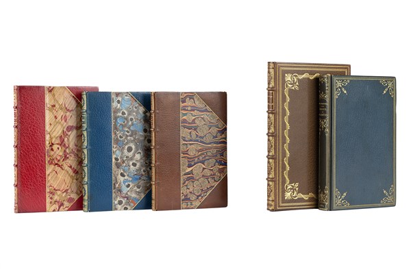 And two works by T. GAUTIER. Omphale. Paris: A. Ferroud, 1896. Copy no. XLVI of 50 copies in Japon paper with 3 states of etchings and a splendid binding signed by Marius Michiel with case - Emanux et Camées. Paris: L. Conquet, 1887. Copy no. 272 of 700 with blue morocco binding decorated in gilt and signed by L. Guetant.