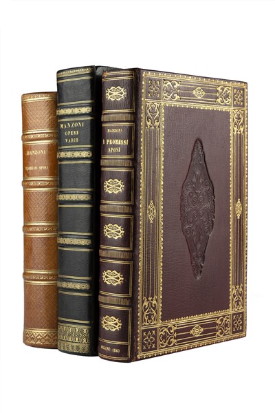 Interesting lot of works dedicated to the famous Milanese author including the first definitive edition of The Promessi Sposi (Milan: Redaelli, 1840) in a splendid copy in red morocco decorated blindstamp and gold.