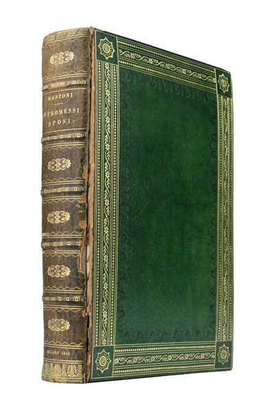 Copia pulita e in pregiato marocchino verde dell'edizione definitiva dopo la "risciacquatura in Arno" e prima edizione illustrata, contenente in appendice l'inedita Storia della Colonna Infame, introdotta da una propria antiporta. Le illustrazioni nel testo sono disegnate da Francesco Gonin, Paolo e Luigi Riccardi, Massimo D'Azeglio ed incise su legno da Bernard Pollet, Sheeres e Luigi Sacchi.