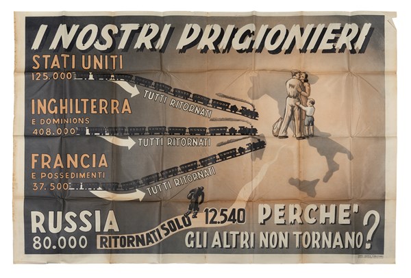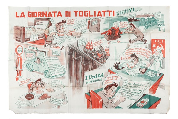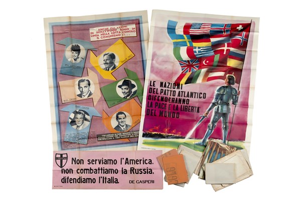 Lot of propaganda posters from the DC for the 1946 elections. In addition to the classic depictions of the crusader shield and the Italian family, in the majority of cases the posters convey harsh attacks on the Italian Communist Party ("Bisogna vincere costi quel che può costare" "Chi vota per Garibaldi vota per il Comunismo") and praise for the Atlantic reconstruction plan. An insight into the strong ideological tensions and divisions that existed in the country following the birth of the Republic