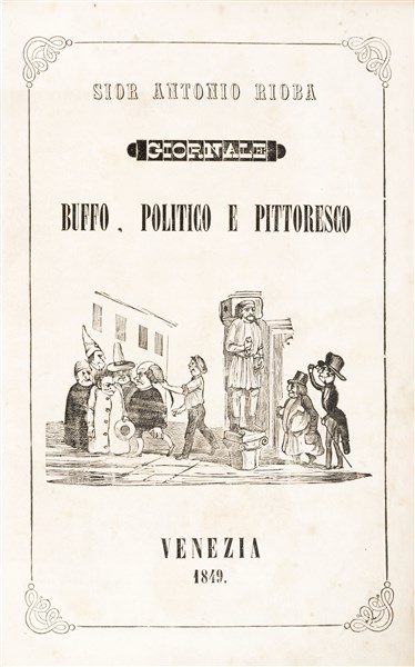 8vo (240 x 150mm). 152 issues (from no. 1 of 13 July 1848 to no. 152 of 28 December 1848) numerous humorous cartoons in text (browning). Printed editorial boards (spine partially detached, some chipping) of this very rare Venetian satirical newspaper; [WITH] San Marco, Giornale politico. 8vo, (230 x 160mm). 100 issues, all published (from n.1 of 1 December 1848 to n.100 of Tuesday 13 March 1849). Contemporary half calf with gilt title on spine.