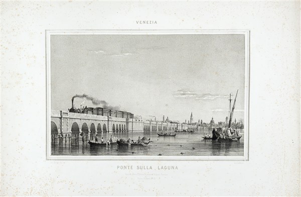 A numerous series of pamphlets, documents, notices, prints, posters, timetables (including one relating to the Milan-Venice-Vienna section) and illustrations concerning the Venice Railway in Milan. In the lot there is also a booklet entitled "The great bridge over the Venetian lagoon that connects Venice to the mainland. inaugurated on 11 January 1846" and 5 large-format engravings (3 hand-colored) dedicated to the Ponte della Libertà and the Treviso station.