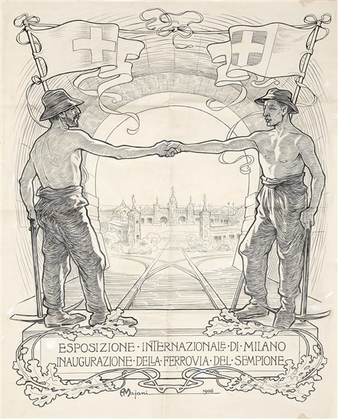 A series of documents, notices, prints, posters, timetables and illustrations concerning the Railway. In the lot the original poster by MAIANI for the inauguration of the Sempione Railway on the occasion of the 1906 Milan International Exposition (900 x 740mm). At the end of the competition, the work of Leopoldo Metlicovitz was selected from which the famous poster was then printed.