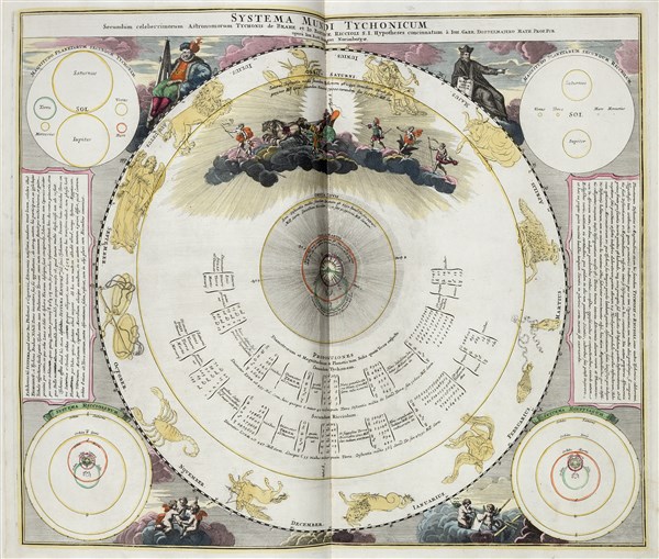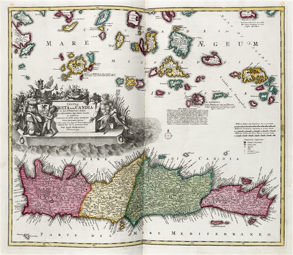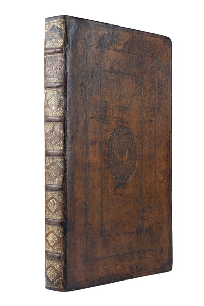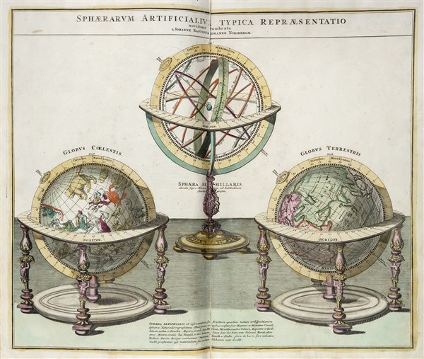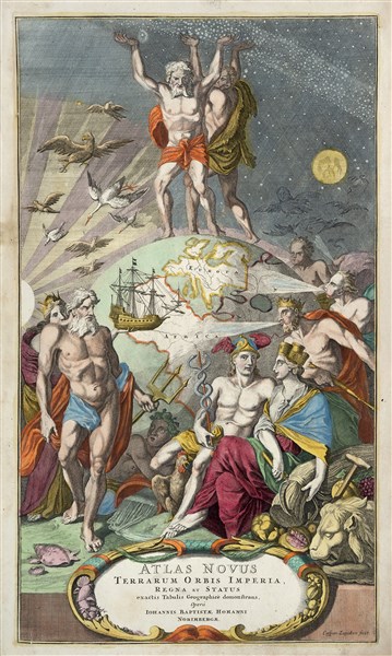 Folio (524 x 320mm). 100 tavole colorate a mano all'epoca che includono l'antiporta allegorica, carte geografiche e tavole celesti da Danckerts, de Ram, Schenk, Doppelmayr e altri, frontespizio in rosso e nero con vignetta calcografica, indice delle tavole, fregi e iniziali xilografiche, su brachette (minuscolo tarlo alle prime brachette e con alcuni rinforzi al margine interno, indice leggermente corto al margine interno, sporadici strappetti, occasionali lievi bruniture e macchie di umidità). Pelle coeva decorata a secco con globo ai piatti, dorso dorato (reindorsato espertamente preservando il dorso originale, alcuni altri restauri e difetti minori).