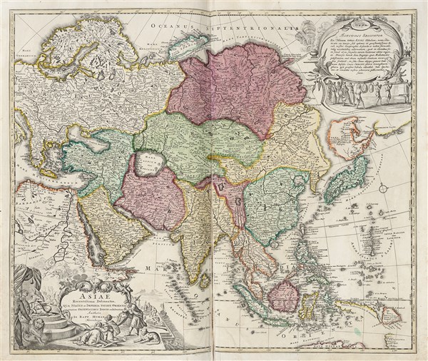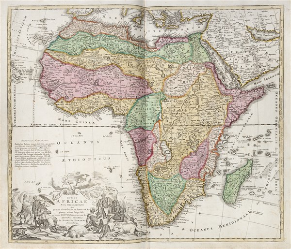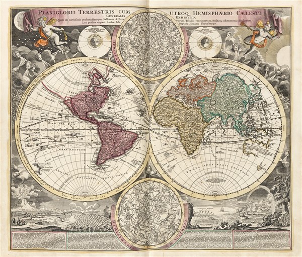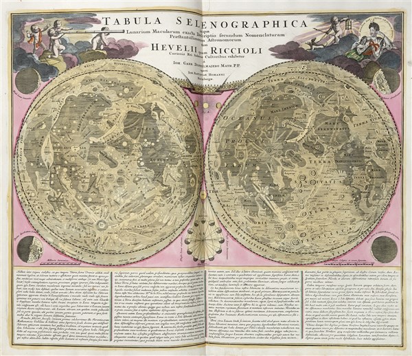 Splendida copia in coloritura e legatura coeva di questo atlante di grandi dimensioni curato da Homann. Fra le mappe più importanti vi sono quella del mondo e quelle dei 4 continenti, ma ricercate sono anche quelle celesti e quelle dedicate ai pianeti e alla luna oltre alle tavole che rappresentano strumenti scientifici.