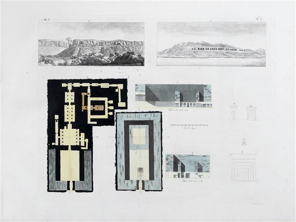 Cospicua raccolta di tavole, tra cui alcune a colori, dalle celebre e monumentale opera di Rosellini sui monumenti dell'Egitto insieme ai 9 volumi di testo.
