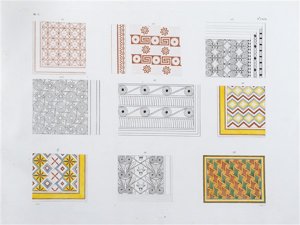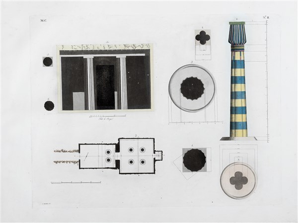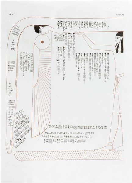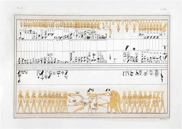 A large collection of plates, including some in colour, from the famous and monumental work of Rosellini on the monuments of Egypt together with the 9 volumes of text. 9 volumes of text and only 3 volumes of plates. Volumes of text: 8vo (242 x 150mm), collated and complete with the 58 plates, some folding and one in colour (some staining and spotting, occasional small marginal tears, one table with tear at the fold). Editorial wrappers printed in black (final volume with some wear). Volumes of plates: elephant folio (550 x 770mm). Half-titles, titles (in double-copy with the second copy in loosly inserted), dedication, index of the plates, 169 plates, some in colour or partly colored as follows: volume I with 42 plates, vol. II with 48 plates including some in colour, vol. III with 79 plates (some plates with minimal reinforcements at the margins, others detached or with some browning, some general wear). Modern black cloth. In addition there are two loose sheets with the projections of the Southern and Boreal hemisphere and 2 loose plates (numbered 65 and 94). The lot is sold as a collection of plates and not subject to return