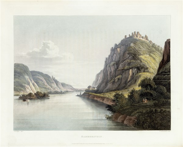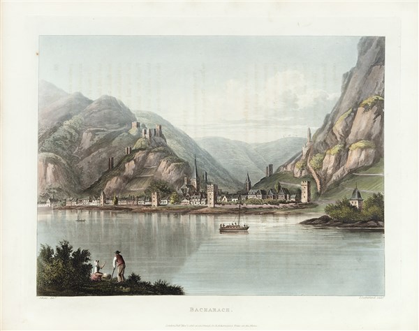Internamente una buona copia con splendida coloritura coeva della prima edizione. Le acquetinte raffigurano vedute di Mentz, il castello di Furstenberg, il castello di Pfalz e la città di Kaub, la pesca del salmone a Lurley, Coblenza, Bornhofen, Colonia e altri siti. Le filigrane delle tavole sono datate 1816-17 e quelle del testo 1817 rendendo questa una delle prime tirature.