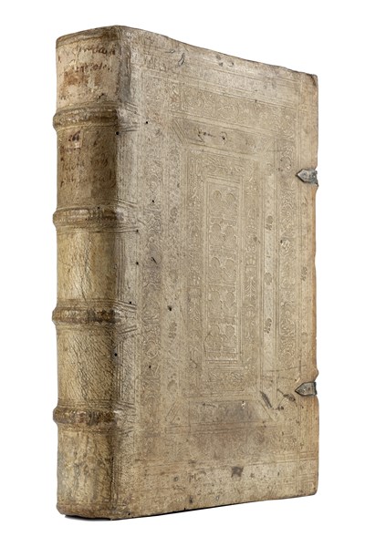 Folio (313 x 215mm). Diagrammi e illustrazioni nel testo (8 forellini di tarlo che interessano il frontespizio e gran parte dell'opera senza però sostanziali perdite di testo, lievi macchie al frontespizio, lievi bruniture). Pelle di scrofa coeva decorata a secco a cornici floreali e con icone di santi su assi di legno, fermagli originali in ottone, tracce di antico tassello cartaceo al dorso (segni di usura). Provenienza: iscrizione coeva al frontespizio: "Caputinorum Constantiae".