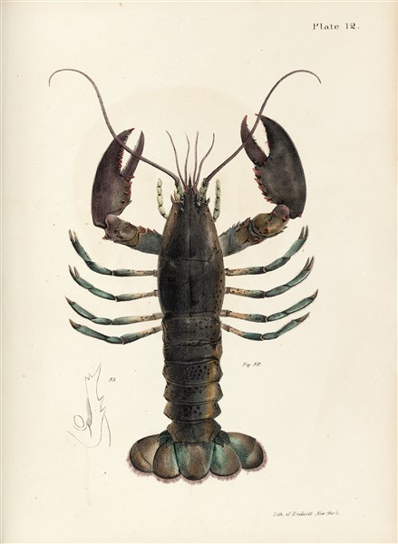 2 parts in one volume, folio (289 x 230mm). Title with fine woodcut arms, 40 hand-colored plates of mollusks (two browned), 13 hand-colored plates of crustaceans (one browned, very light spotting, browning and scattered stains). Contemporary canvas with arabesques in bas-relief on the front and rear cover, large golden shell in the center, gilt title on spine (lightly rubbed). Provenance: Davenport Academy of Sciences (membership stamp). Provenance: "Davenport Academy of Sciences" (stamp).