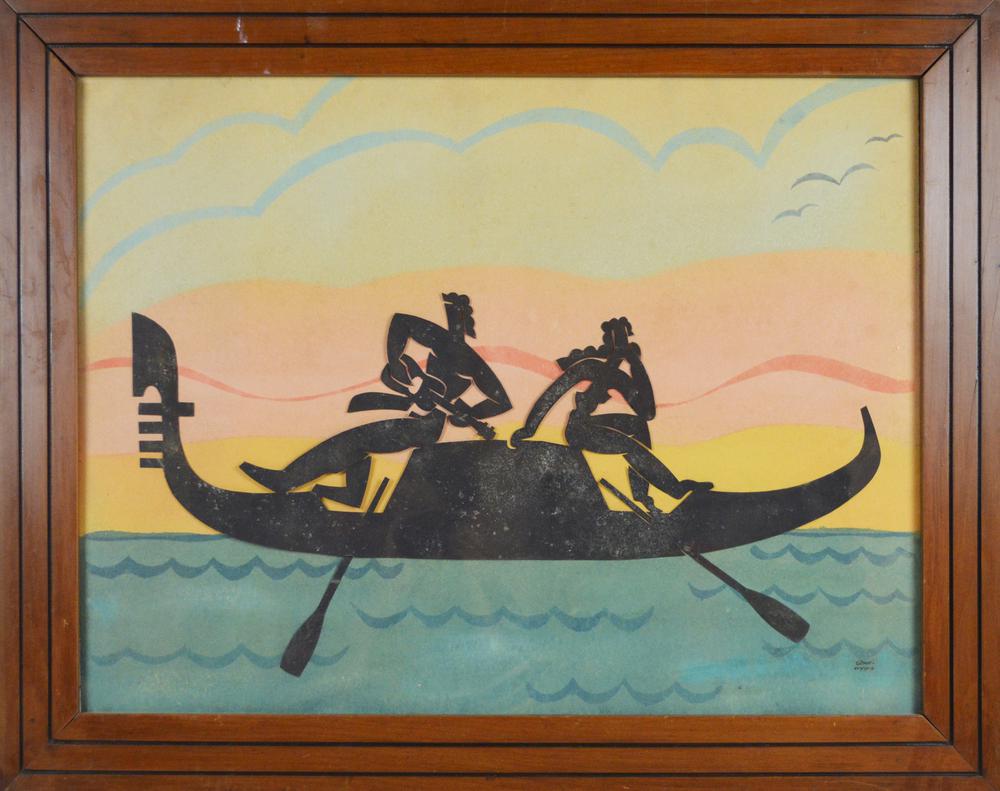 Autore del XX secolo SENZA TITOLO (SERENATA IN GONDOLA) gouache e collage su...