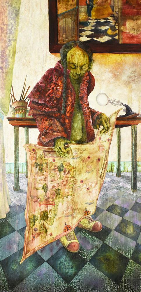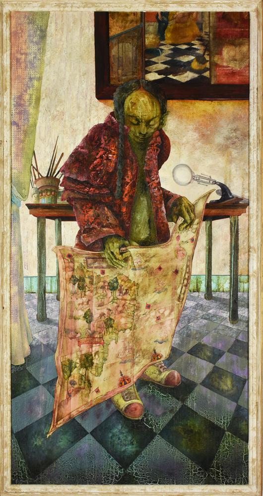 Giorgio Poppi LOPO HOMEN CARTOGRAFO olio su tela, cm 140x70 sul retro: firma,...
