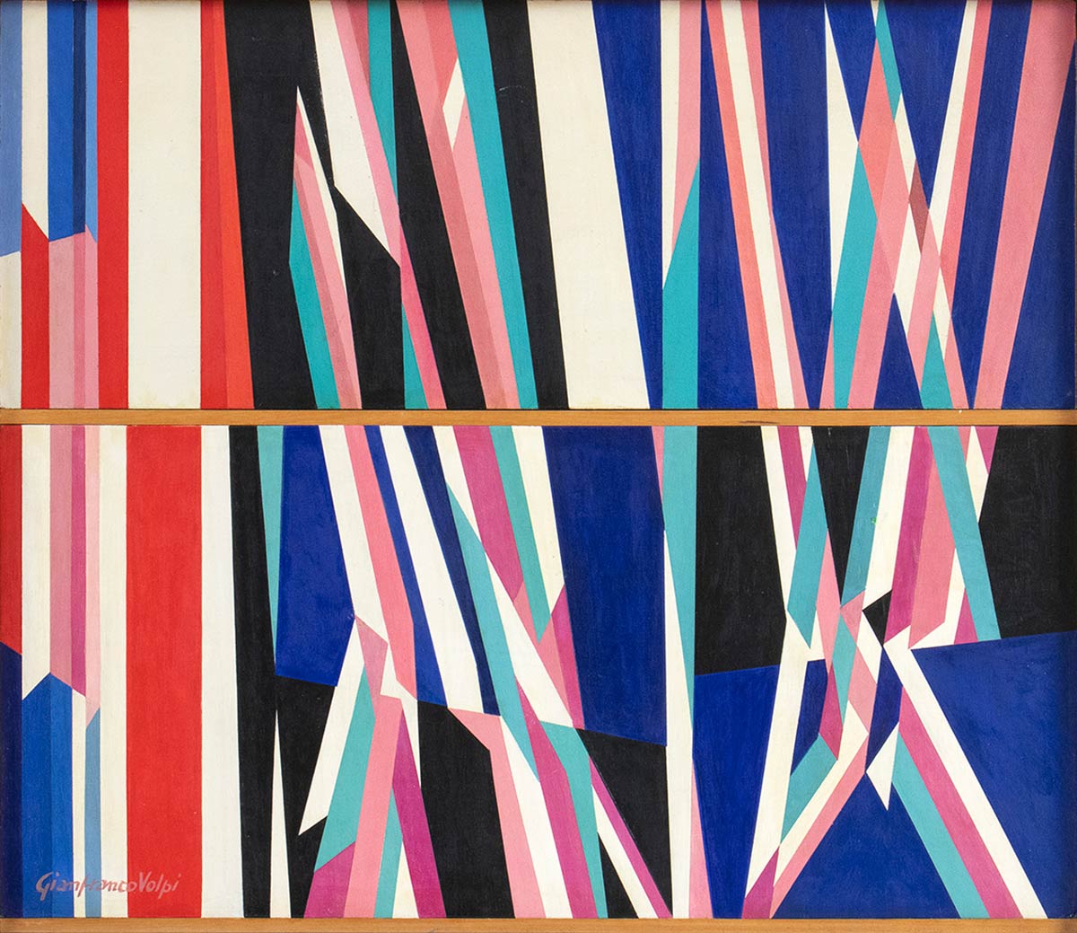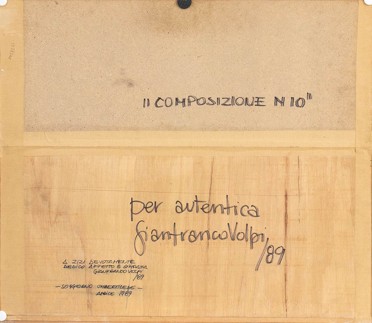Firma, titolo, data e dedica al retro: Gianfranco Volpi, Composizione n°10, 1989, “A Zizi devotamente dedico affetto e simpatia. Soggiorno umbertidese, aprile 1989”