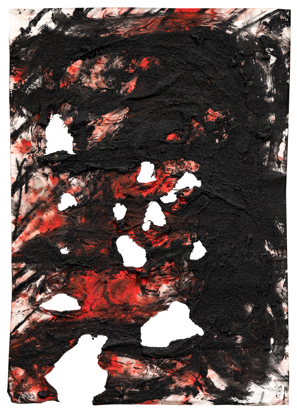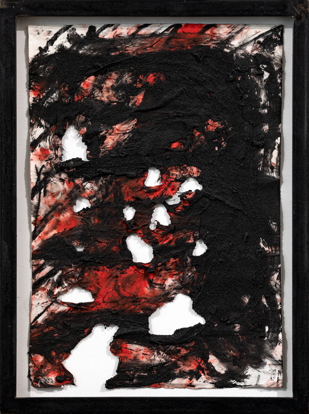 Sabbia di vulcano, ossido di ferro nero e carbone su carta applicata su tavola entro cornice in ferro