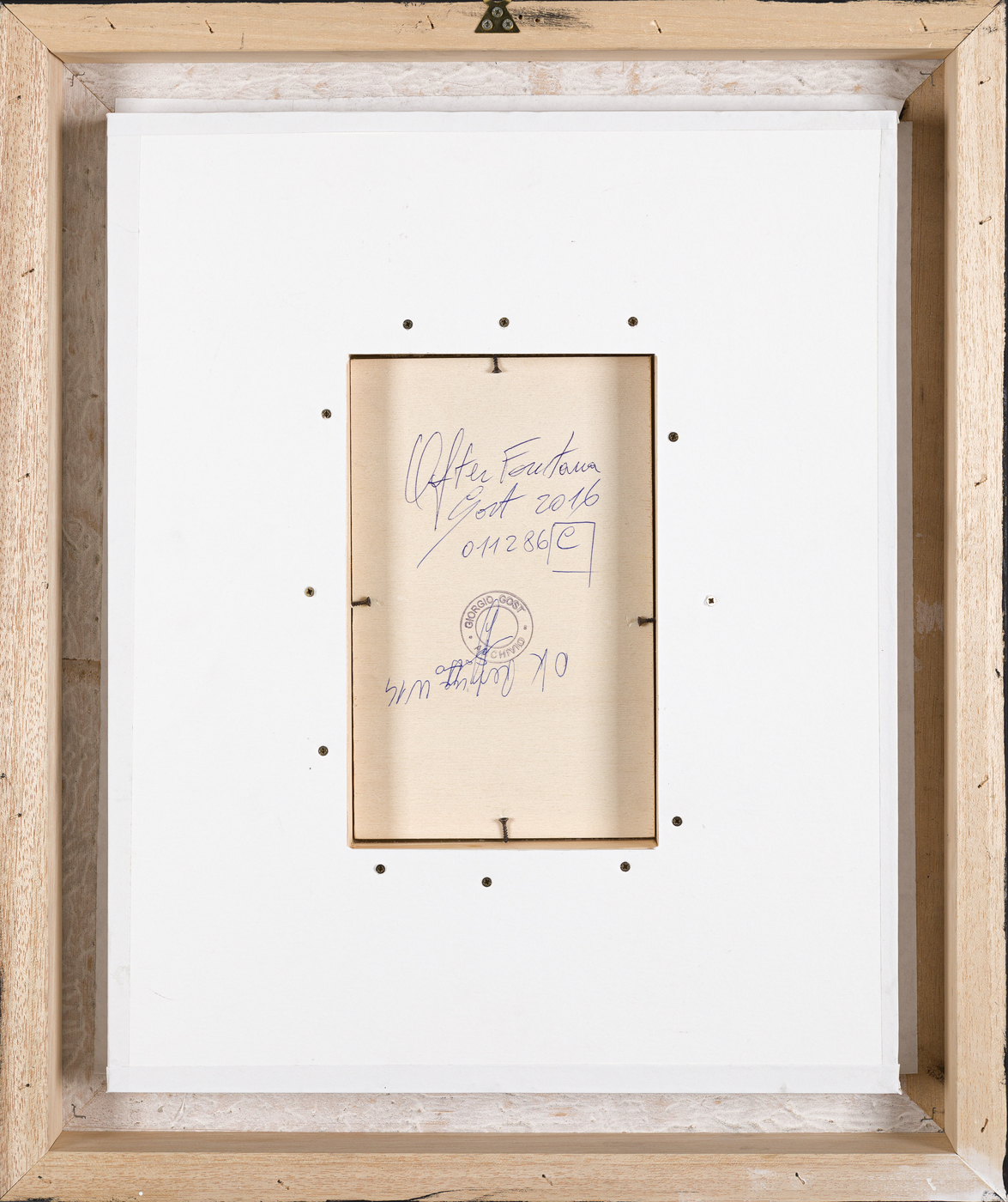 Firma, titolo, datazione, timbro dell'Artista e numero di repertorio al retro