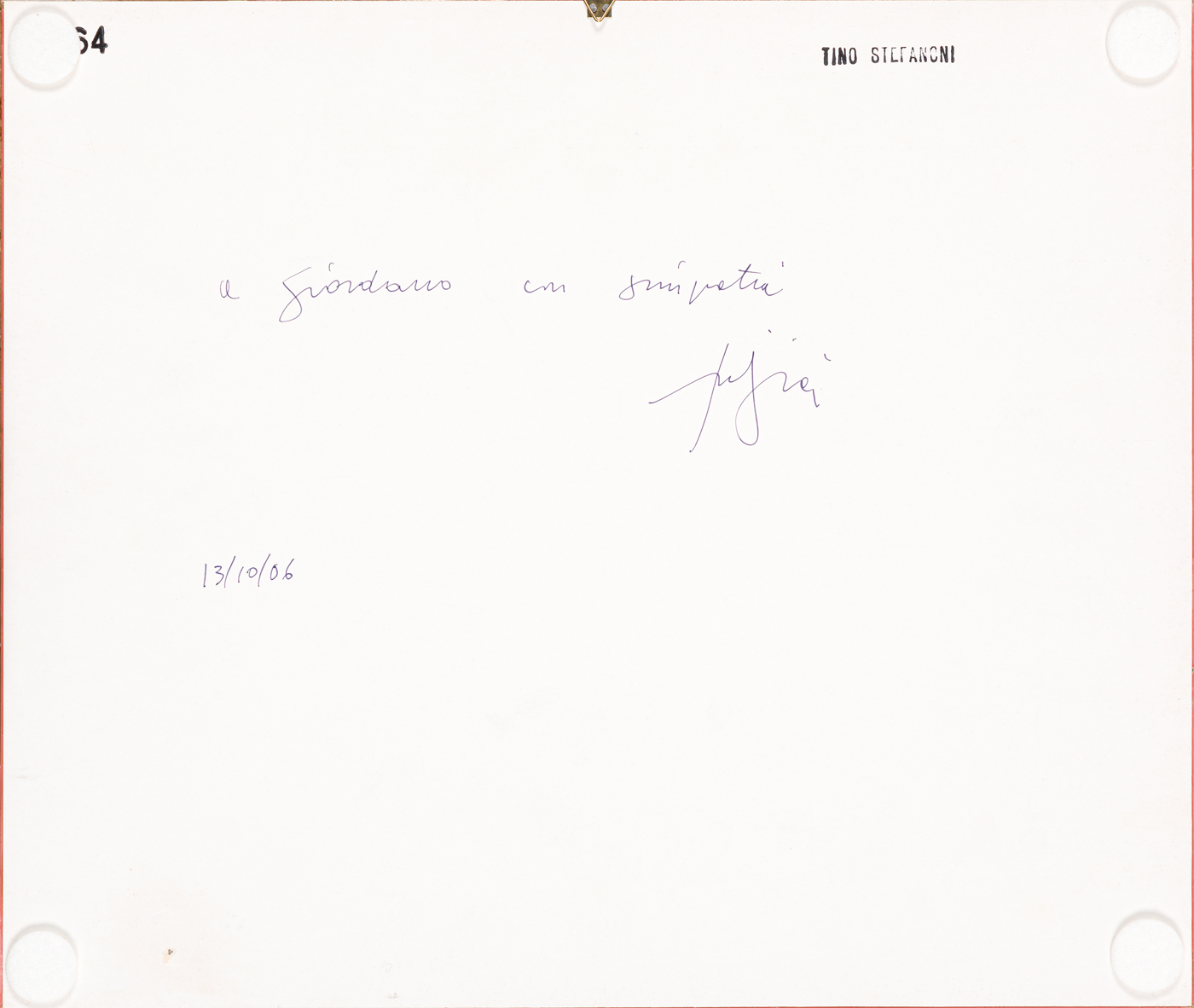 Firma, datazione, dedica ad personam e timbro dell'Artista al retro del cartone protettivo