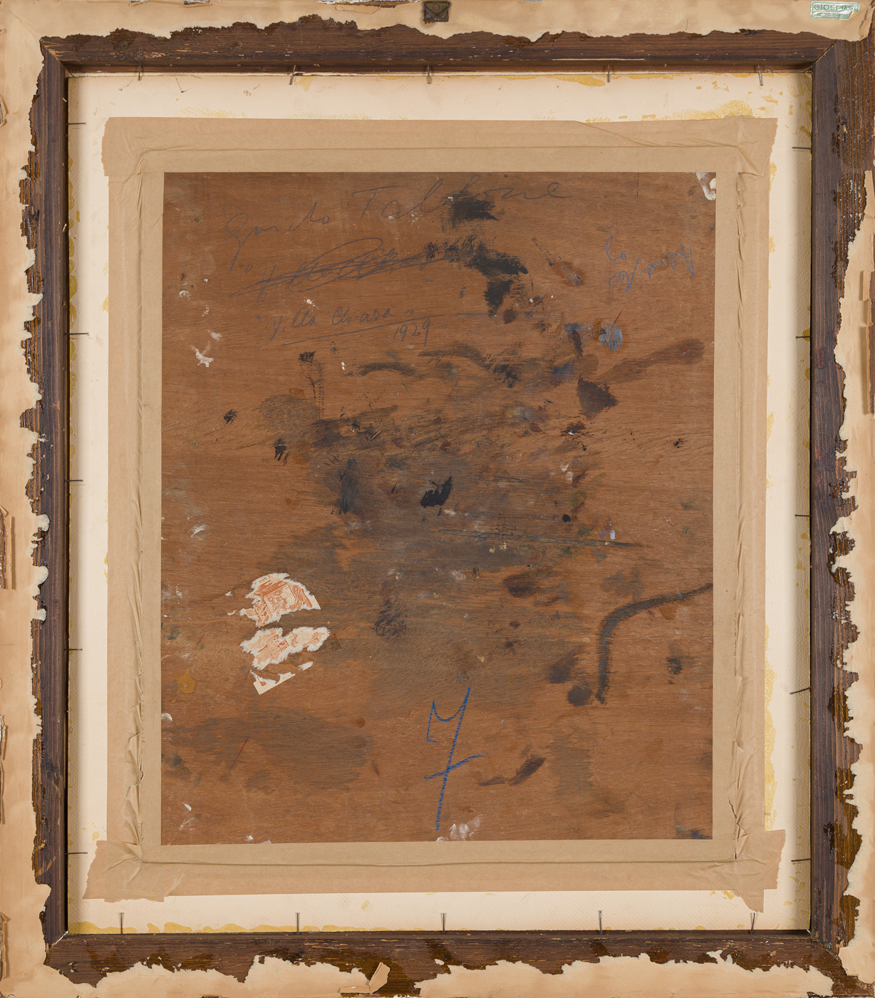 Etichetta parzialmente visibile della Galleria Pesaro (MI) al retro