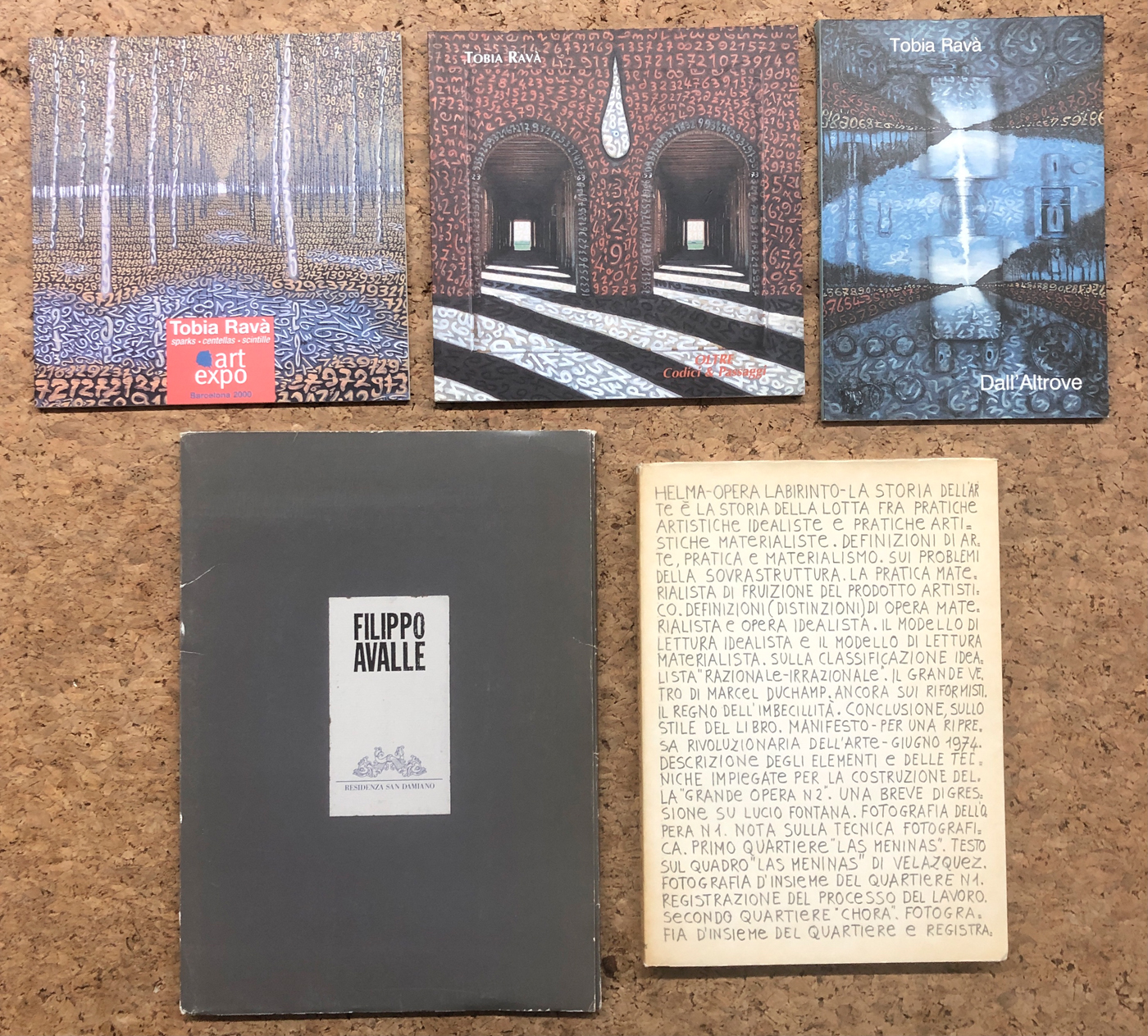 Lotto unico di 5 cataloghi relativi ad esposizione degli artisti Filippo Avalle e Tobia Ravà tra cui un raro catalogo edito nel 1975 dalle Edizioni Apollinaire, Milano: 'Helma. Opera Labirinto' con testi di Filippo Avalle e Giovanni Bottiroli e fotografie di Toni Luzio. Edizione di 1000 copie non numerate, entro custodia cartonata
