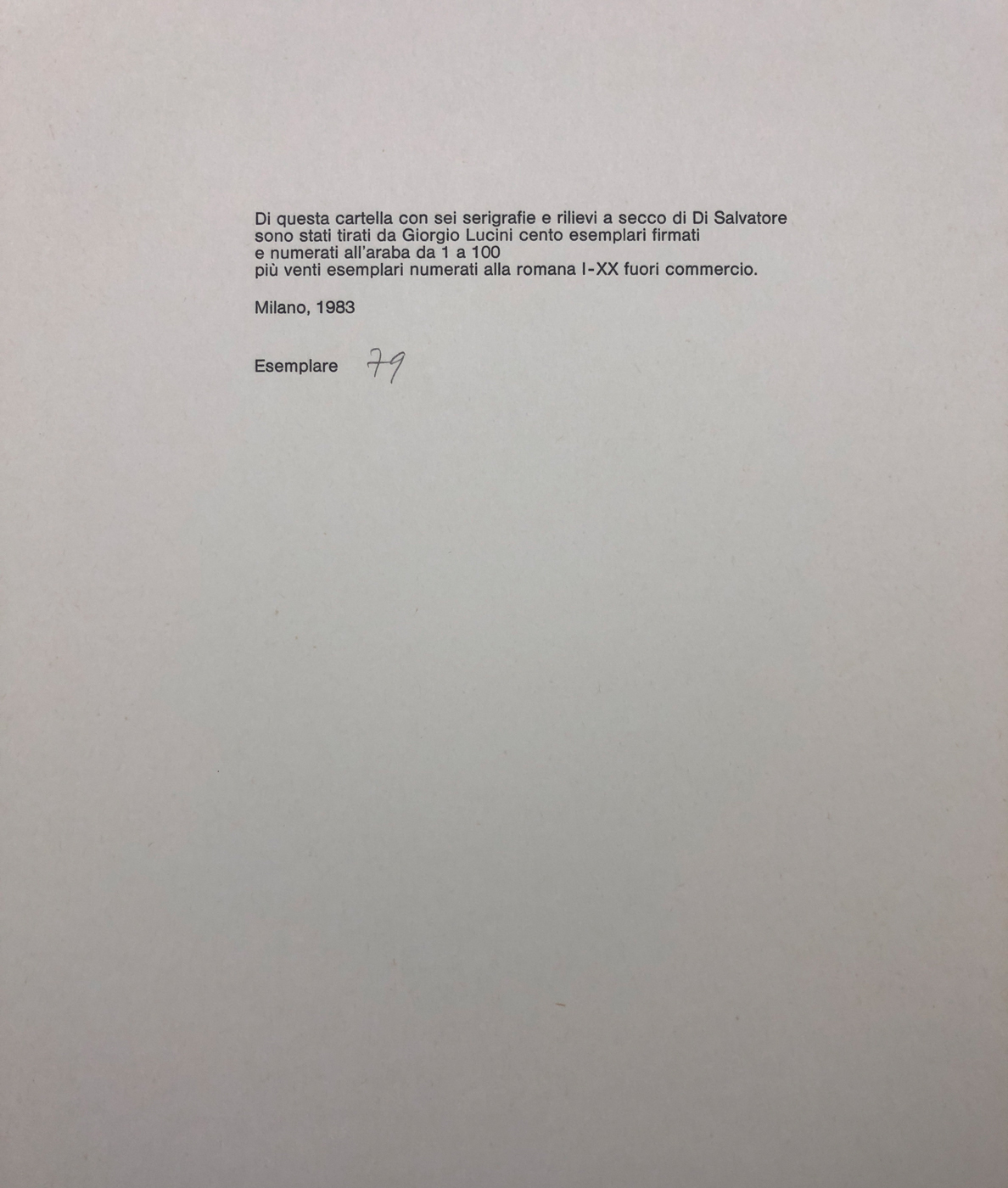 Cartella contenente prefazione di Riccardo Barletta e 6 splendide serigrafie con rilievi a secco di Nino Di Salvatore, ciascuna recante firma e numerazione (Esemplari 79/100) a matita al fronte