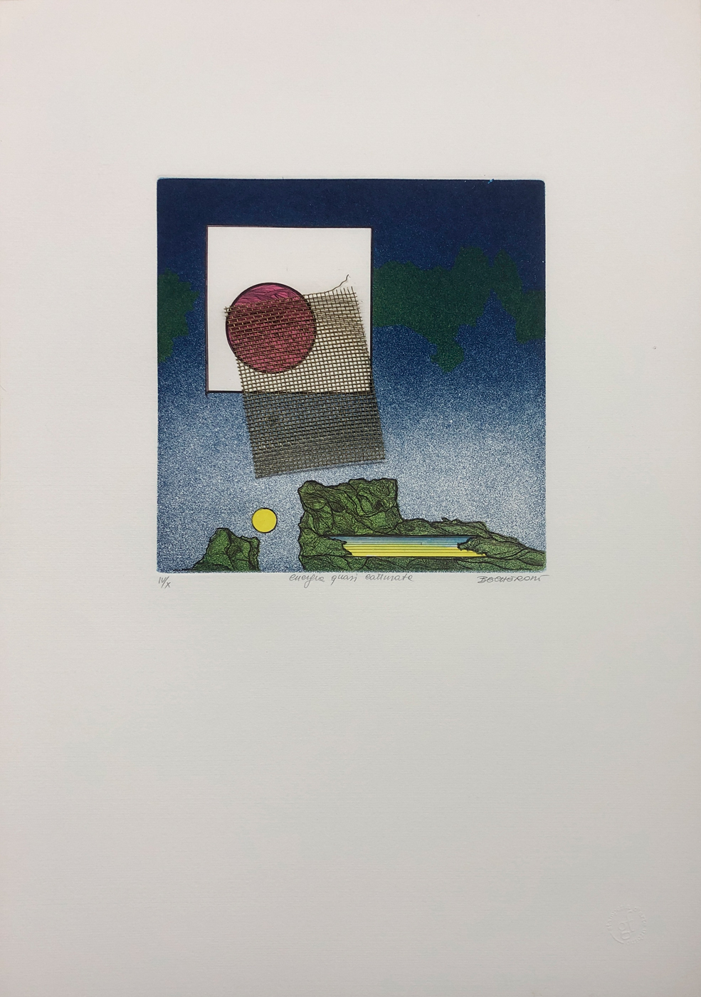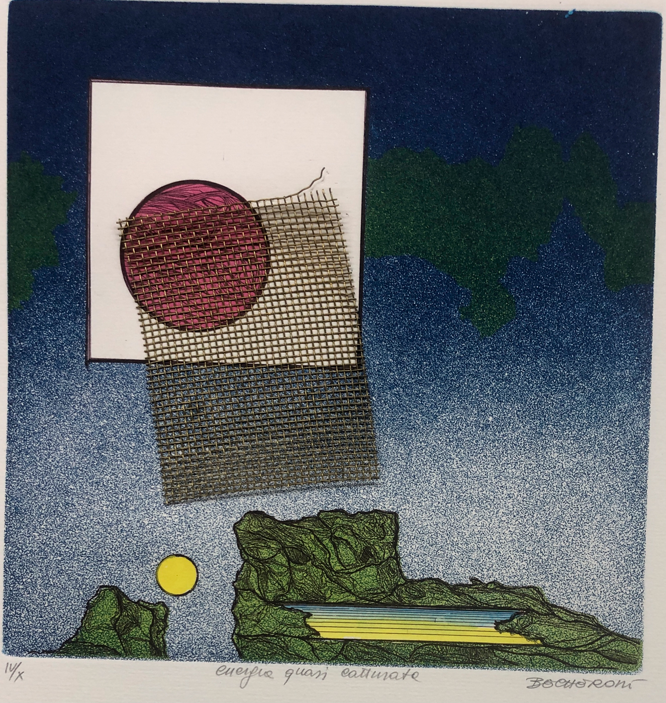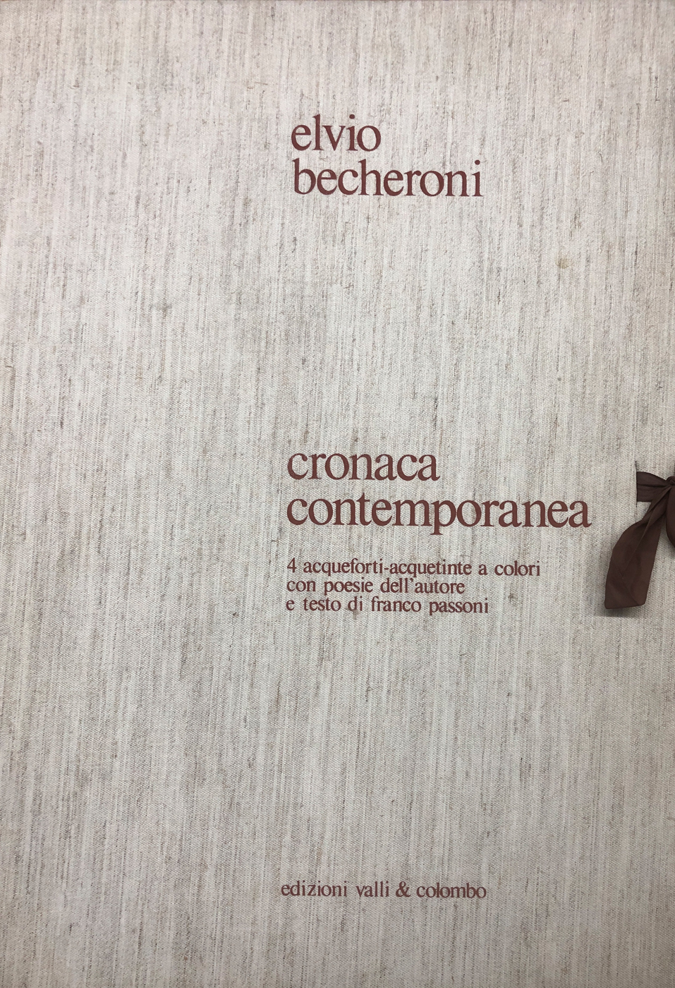Cartella contenente testo di presentazione di Franco Passoni, 4 poesie di Elvio Becheroni e 4 acqueforti-acquetinte a colori di Elvio Becheroni, ciascuna recante firma, numerazione (Esemplari IV/X), titoli (Segreto di Eva, Personaggio con segreto inviolabile, Energia quasi catturata, Albero meccanico) a matita al fronte e timbro a secco della Stamperia d’arte Urbino GF