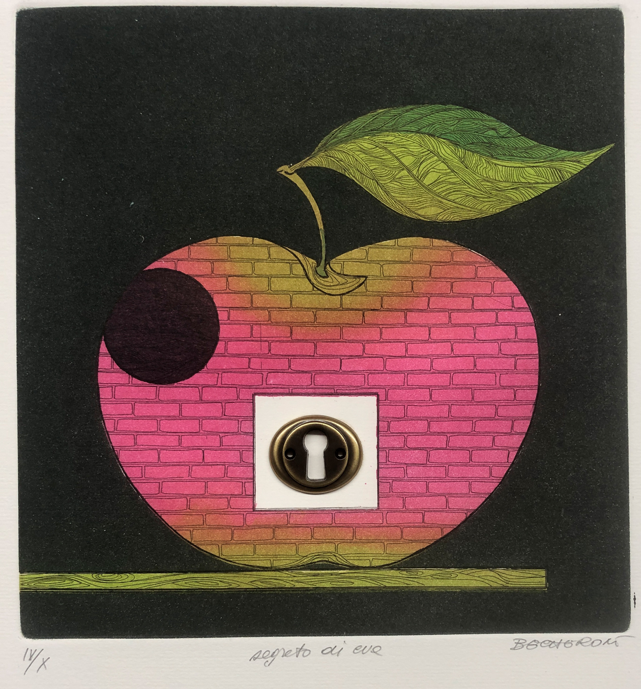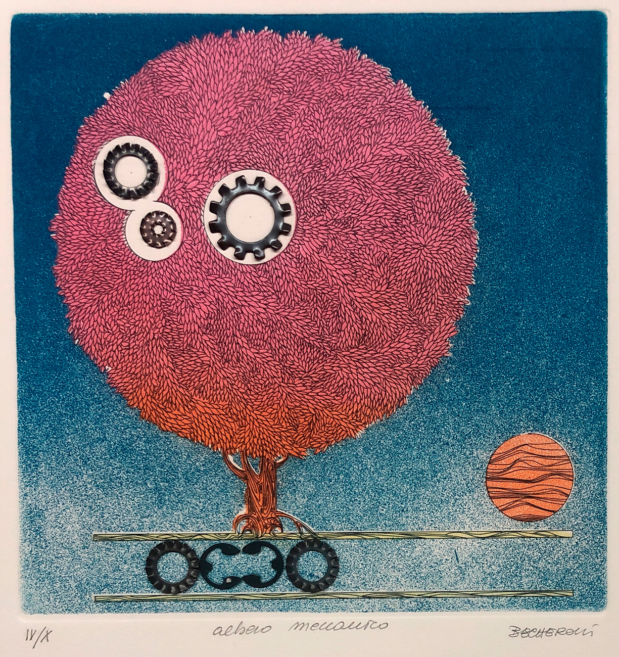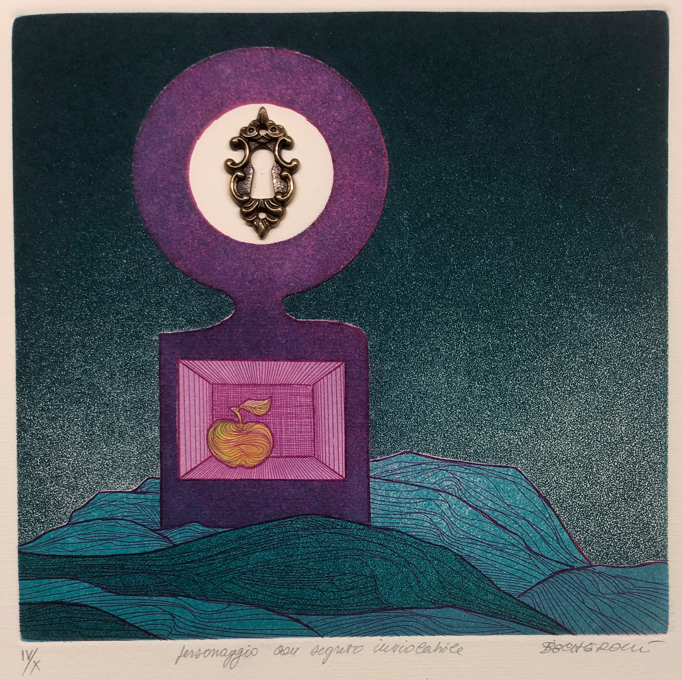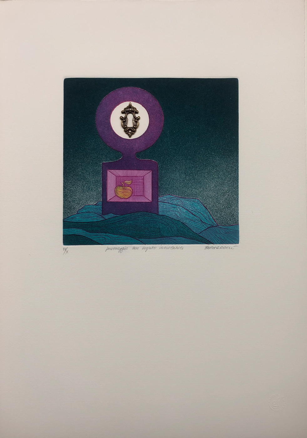 Cartella contenente testo di presentazione di Franco Passoni, 4 poesie di Elvio Becheroni e 4 acqueforti-acquetinte a colori di Elvio Becheroni, ciascuna recante firma, numerazione (Esemplari IV/X), titoli (Segreto di Eva, Personaggio con segreto inviolabile, Energia quasi catturata, Albero meccanico) a matita al fronte e timbro a secco della Stamperia d’arte Urbino GF