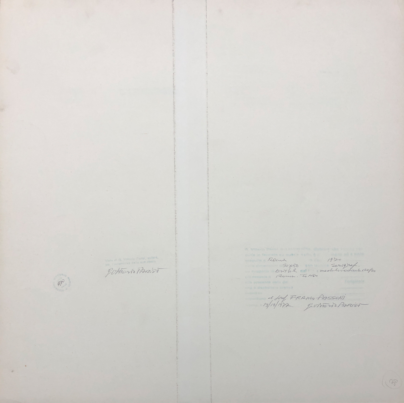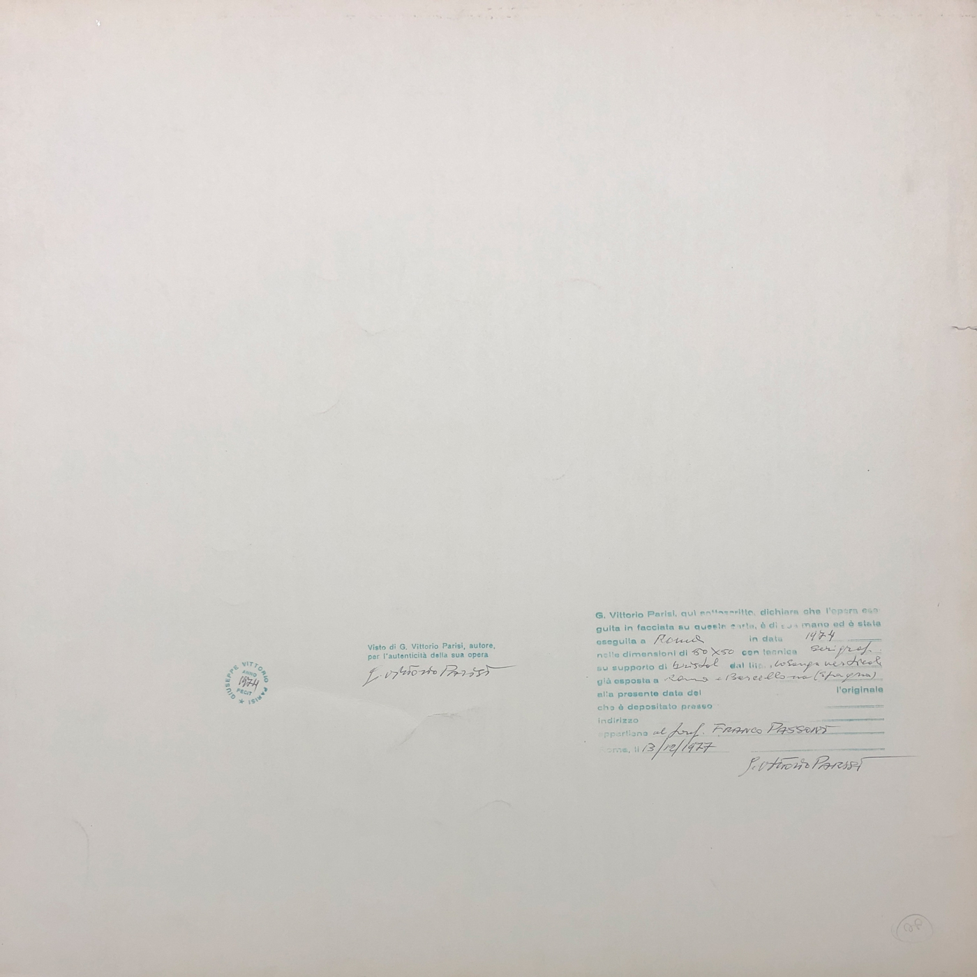 Firma, datazione, misure, tecnica e timbri per autenticità dell’Artista al retro