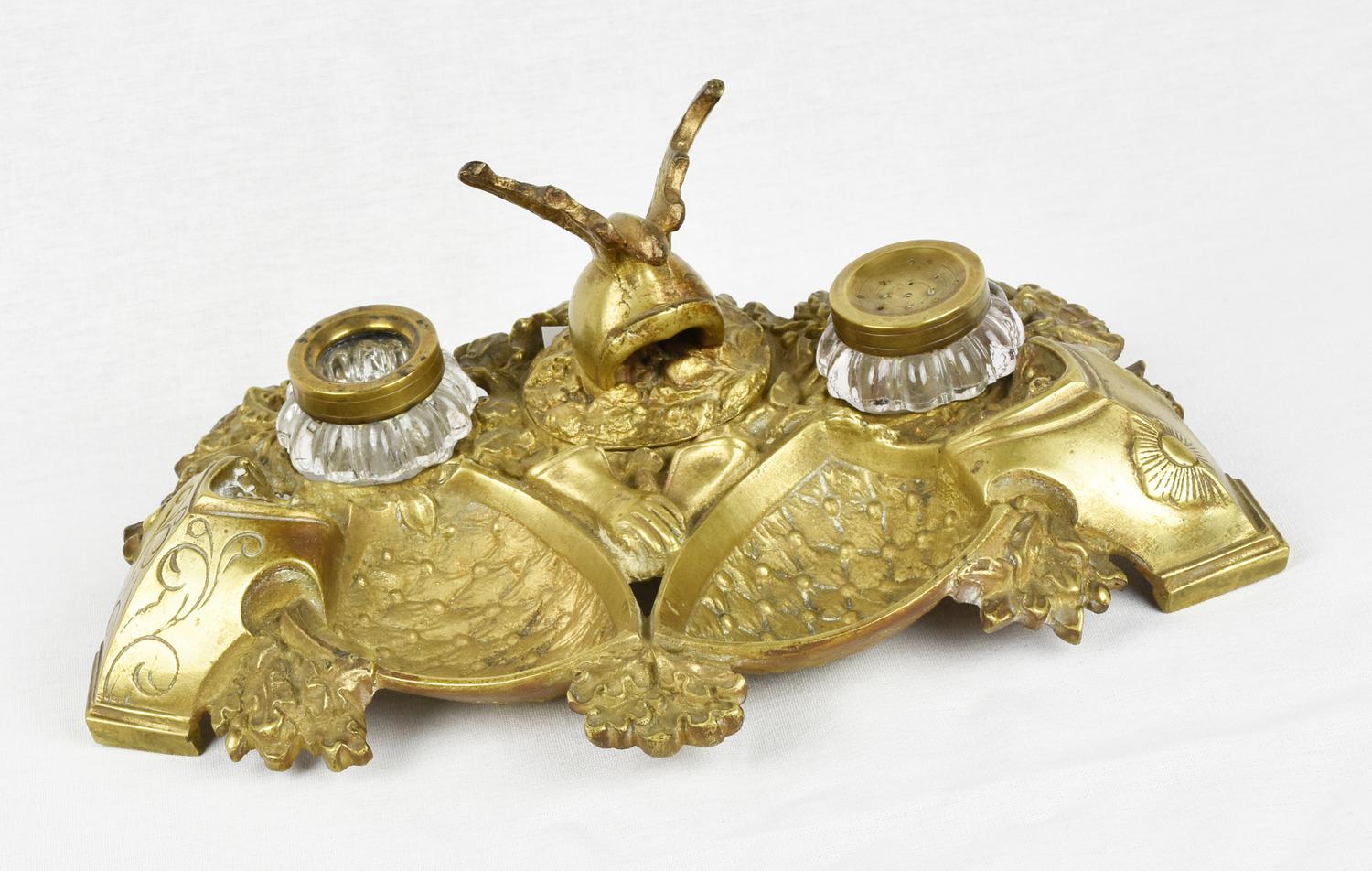 CALAMAIO IN BRONZO finemente cesellato con armature laterali e sormontato da...