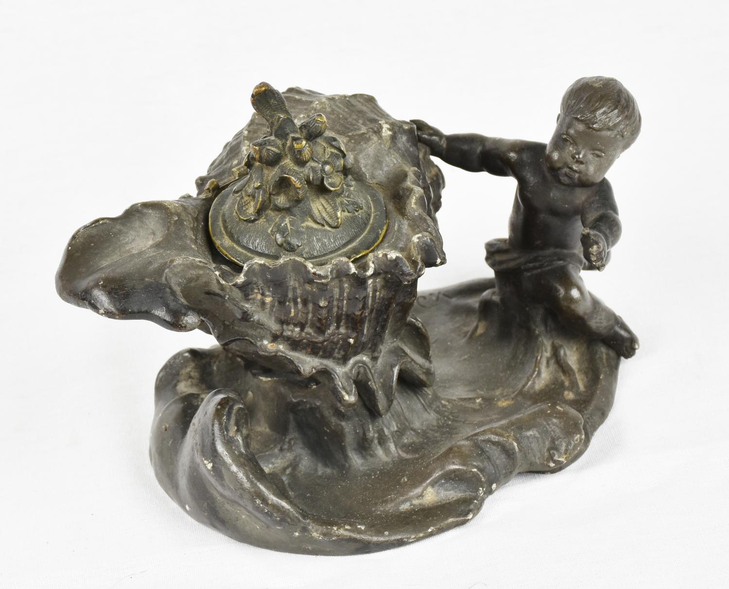 CALAMAIO IN ANTIMONIO a forma di Fontana con putto cerniera del coperchio...
