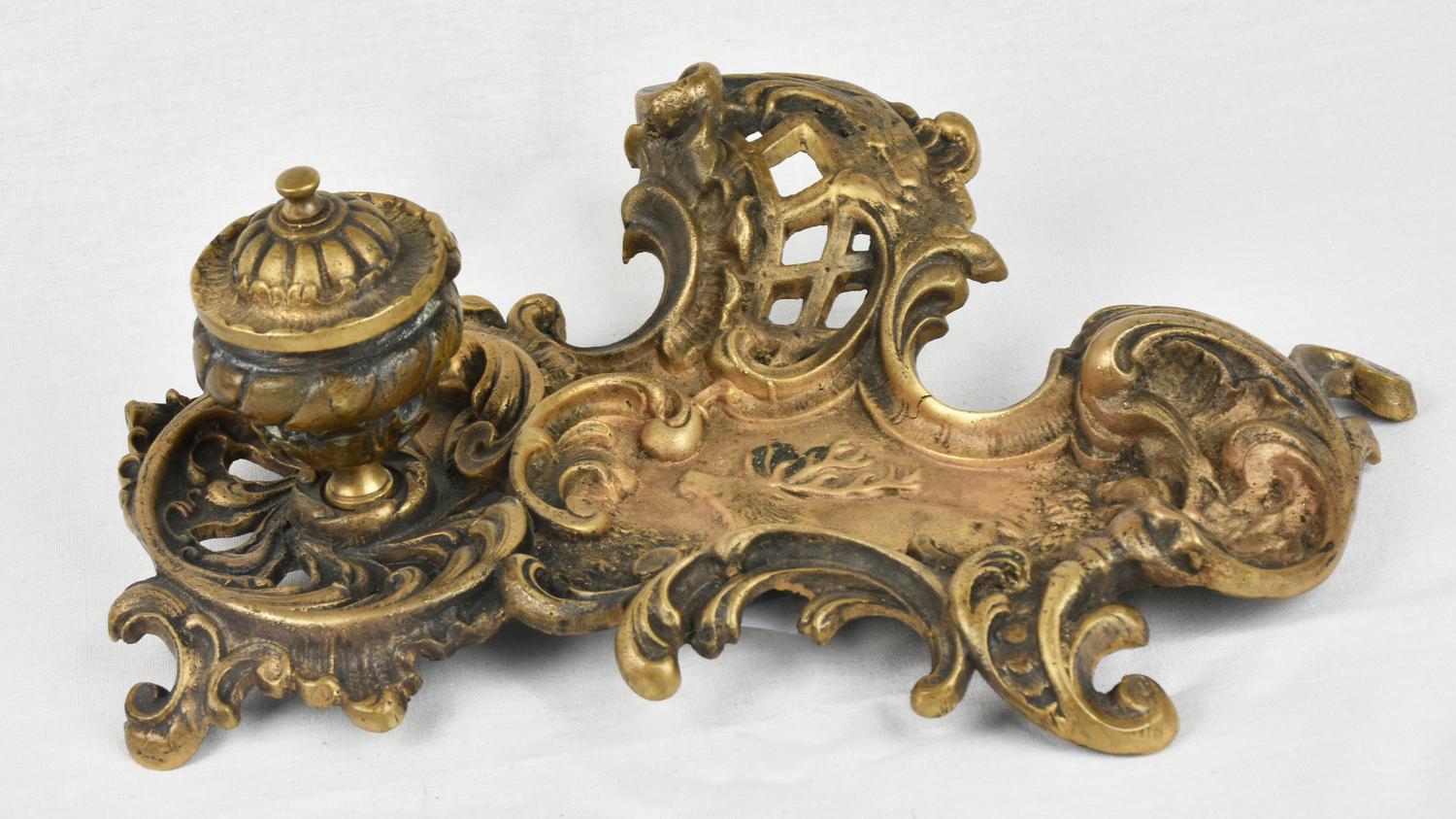 CALAMAIO IN BRONZO cesellato e decorato con cervo centrale Manca ampolla...