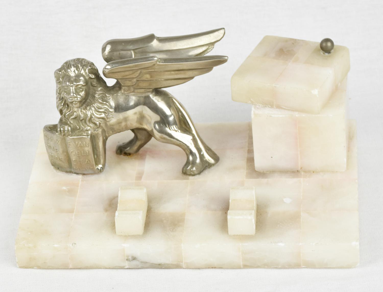 CALAMAIO IN ALABASTRO bianco con scultura in alluminio raffigurante il Leone...