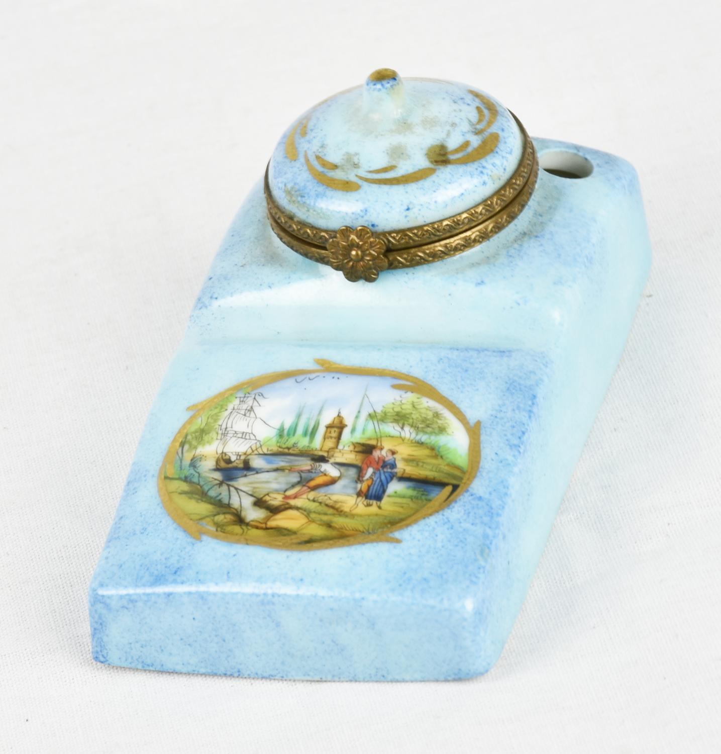 CALAMAIO IN PORCELLANA marchiato Limoges dipinto con scena di pesca su fondo...
