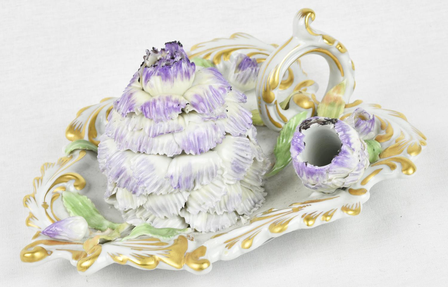 CALAMAIO IN PORCELLANA di Capodimonte a forma di foglia finemente dipinto in...