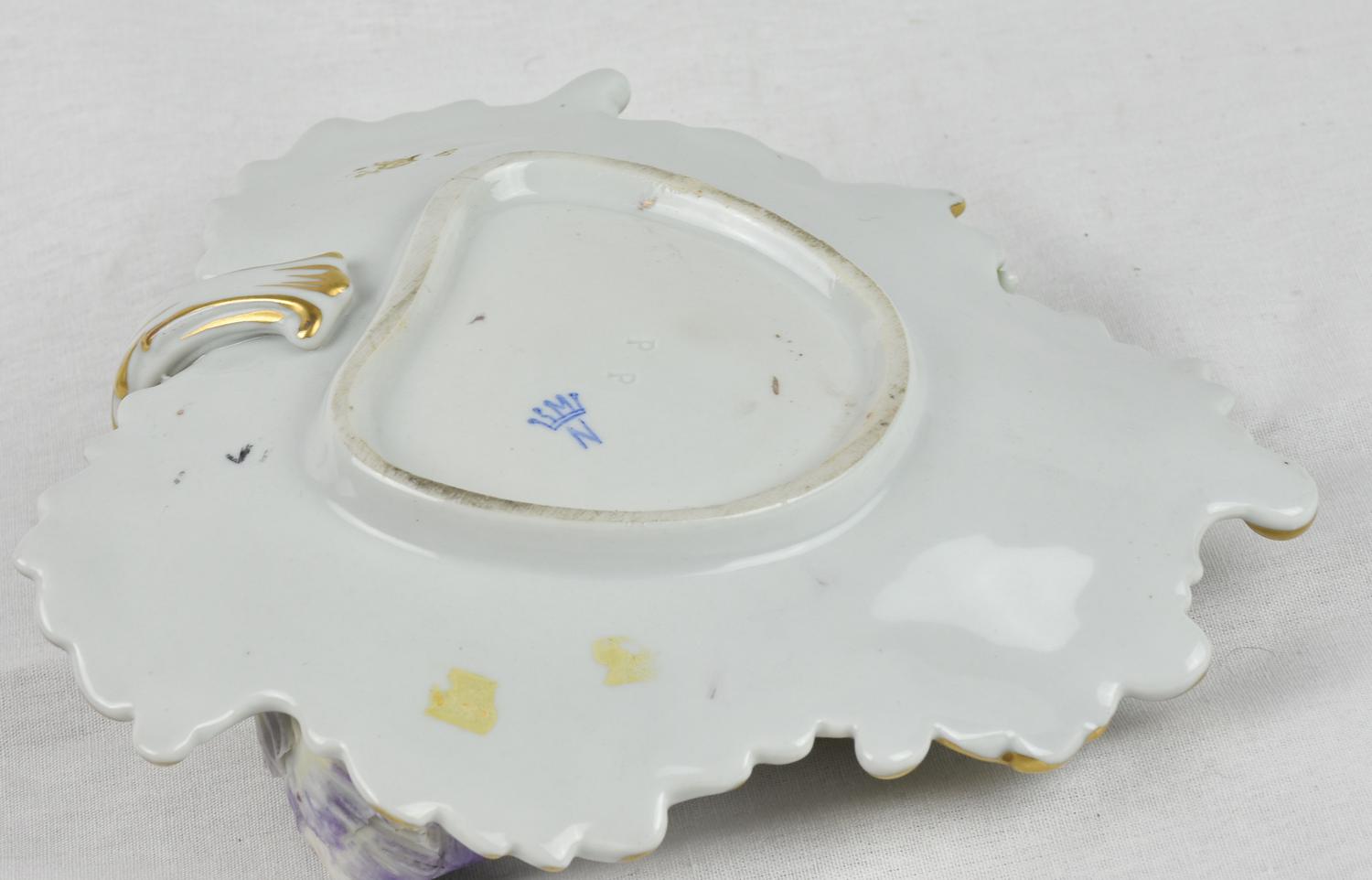di Capodimonte a forma di foglia finemente dipinto in verde, oro e lilla